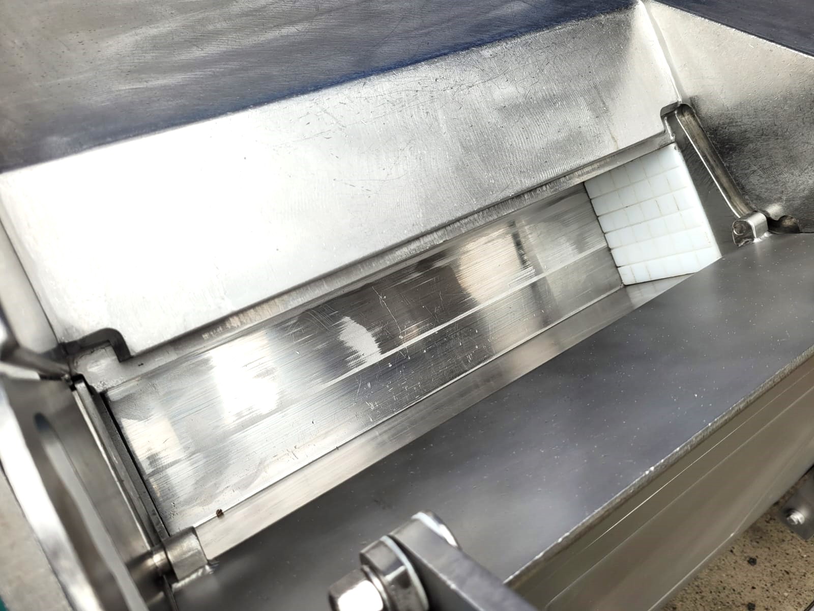 The dicing machine is made entirely of stainless steel, has smooth surfaces, and gently rounded edges. The large working chamber eliminates pre-cutting and allows the placement of, for example, a whole pork neck or well-stuffed products.