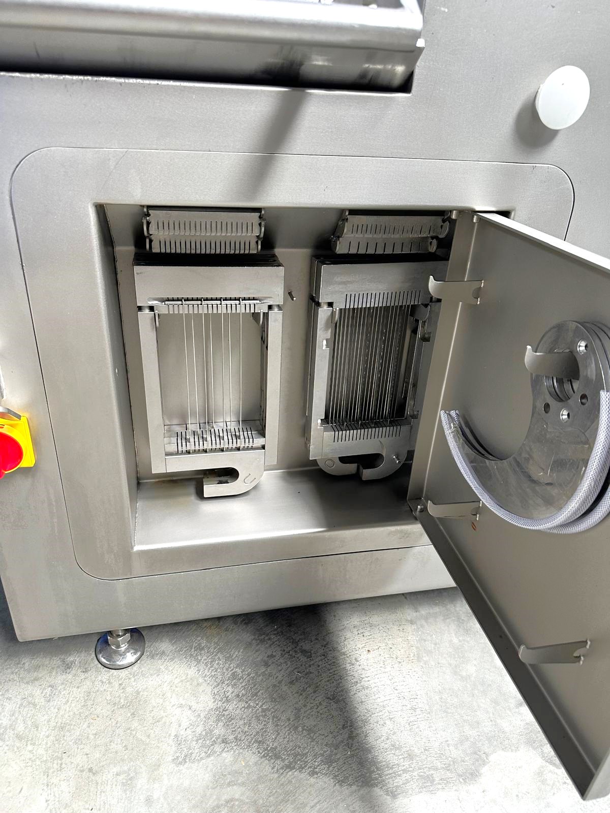 The dicing machine is made entirely of stainless steel, has smooth surfaces, and gently rounded edges. The large working chamber eliminates pre-cutting and allows the placement of, for example, a whole pork neck or well-stuffed products.