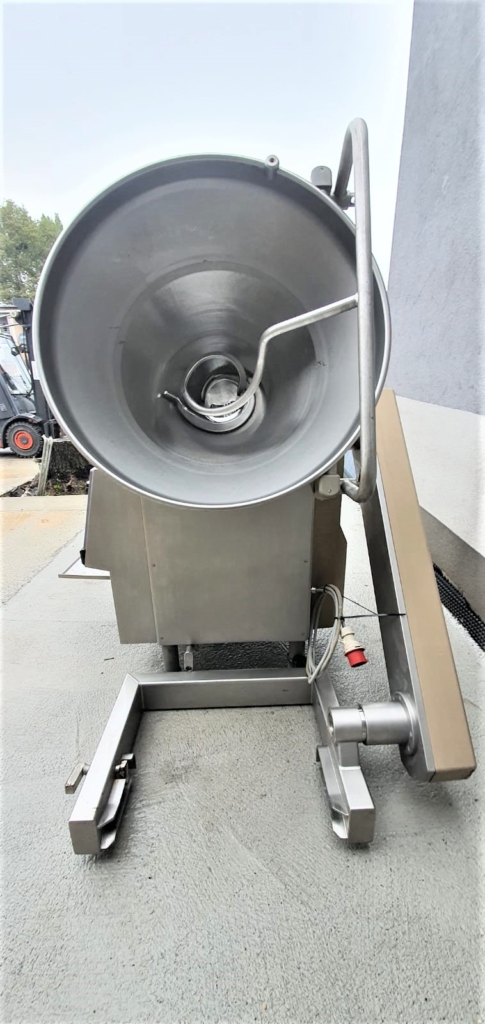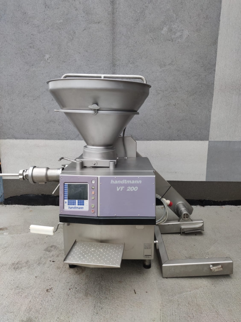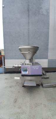 Used Handtmann VF200 vacuum filler, equipped with an integrated loader for 200l meat bins, twister and a Handtmann GMD 93-3 inline grinding head.