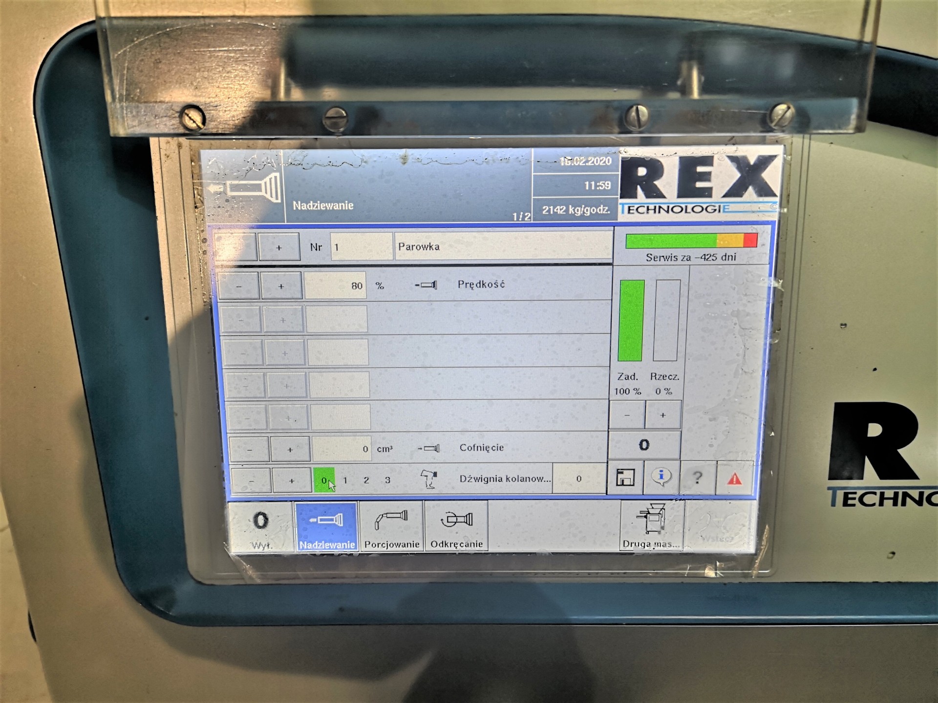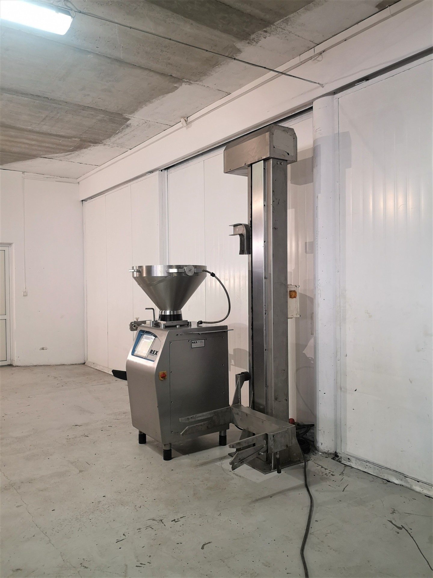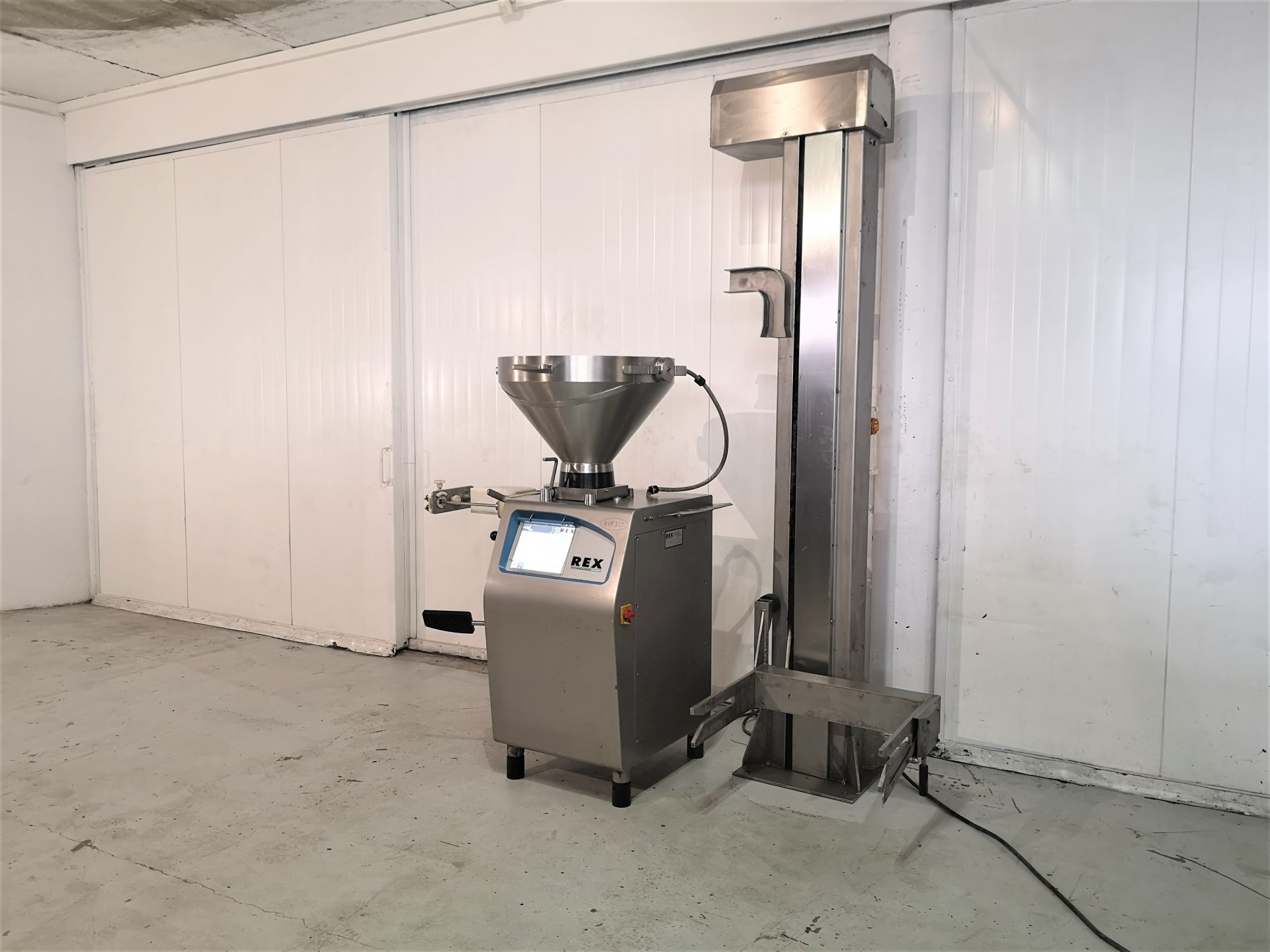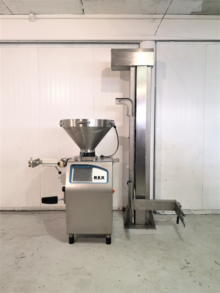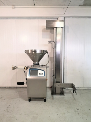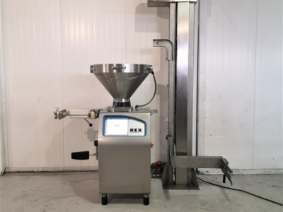 Vacuum filler REX Technologies, model RVF 327. Intended for small and medium-sized enterprises that produce various quantities and assortments of sausages. The stuffer is equipped with a touch screen controller, twister and casing holding device. Loader for 200l Vmag carts is an option.