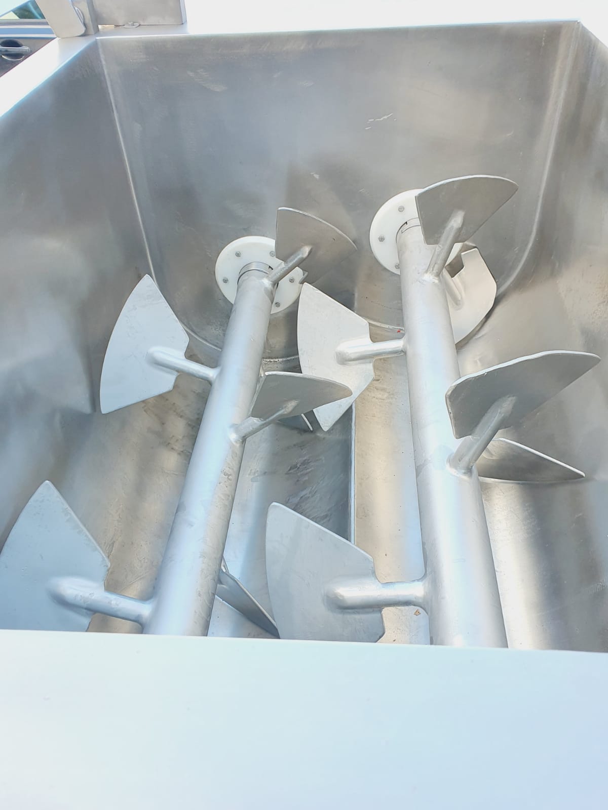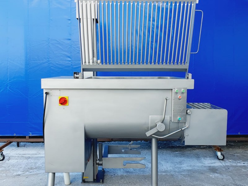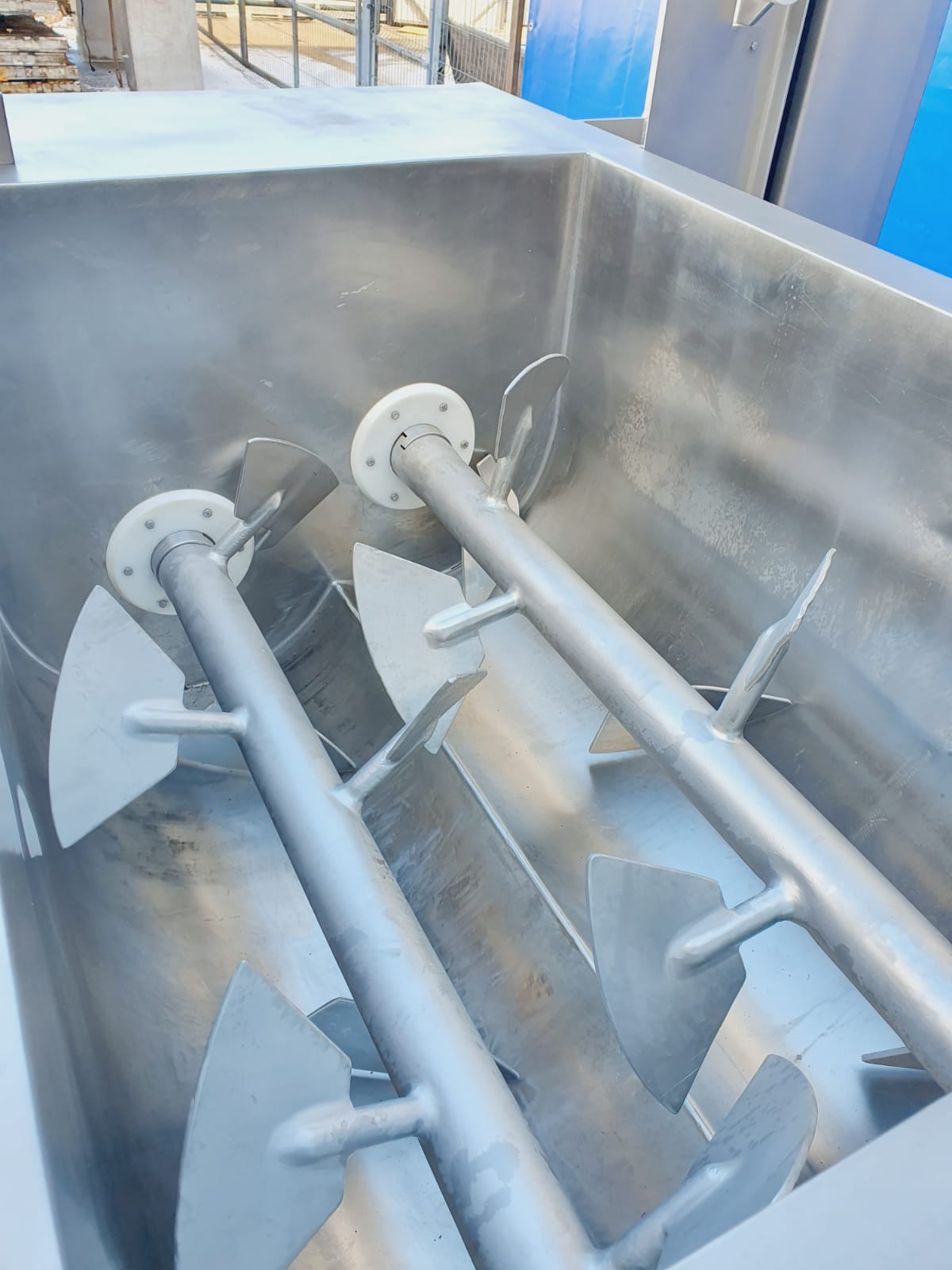 Used paddle mixer Risco RS 450. It can mix any type of meat product or any other mixable product in a very short time. The frame is made entirely of precision polished stainless steel. The combination of the mixing system with cross-over mixing vanes and front automatic product discharge allows for discharge directly into the trolley, emulsifier, transfer pump or directly into the screw conveyor.