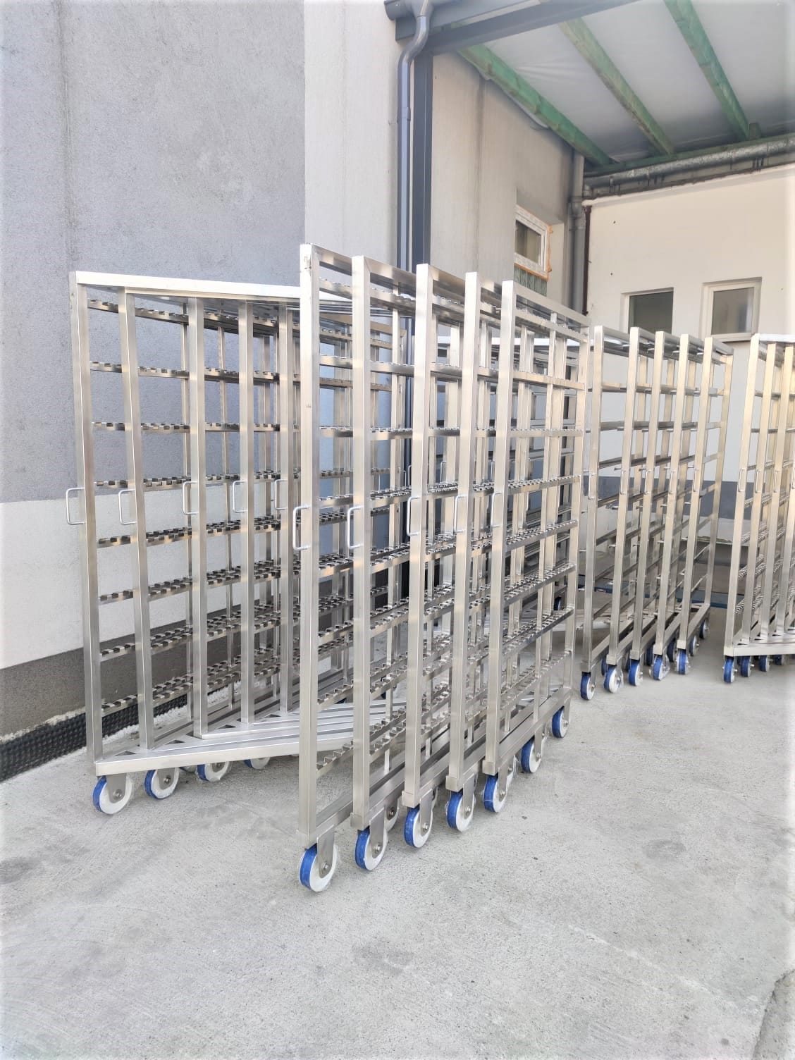 New smoking trolleys type Z. Option with insets or cuts for smoking sticks. The whole thing is made of stainless steel, which guarantees the highest hygiene at work and ease of maintenance. Wheels suitable for a temperature of 120 ° C