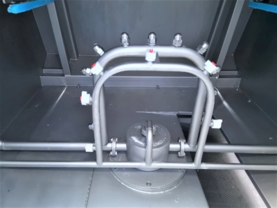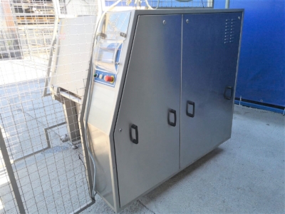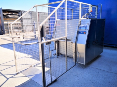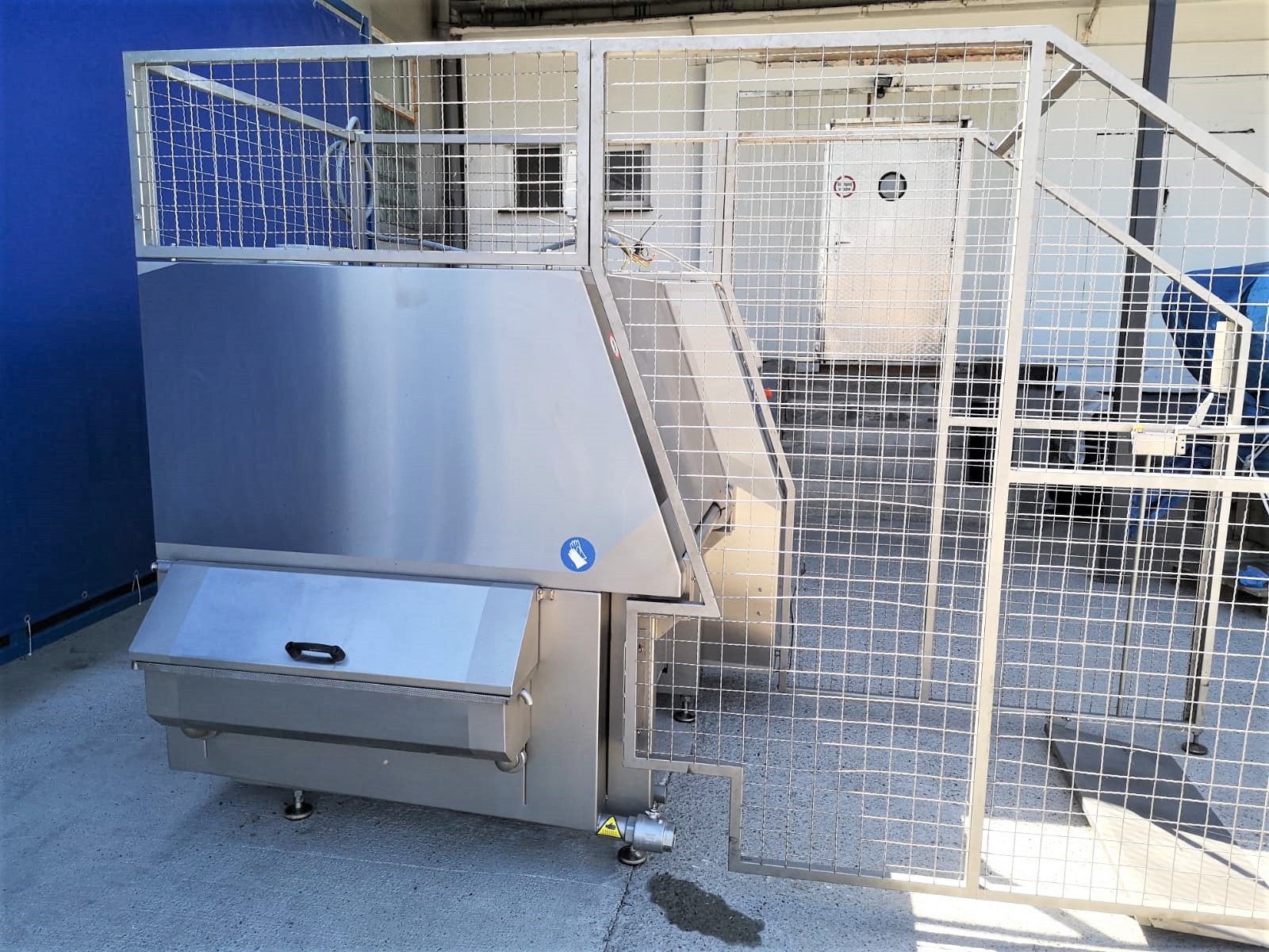 Used Metalbud Nowicki washer for 200l meat bins consists of a washing-rinsing chamber and a loading-unloading device.
