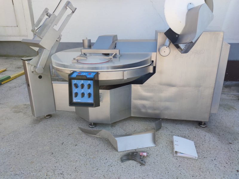 Cutter usado Tipper Tie (Hoegger Alpina) con una capacidad de 330 litros. La máquina es perfecta para cualquier proceso de producción de alimentos donde se requiere la emulsión del producto. El cortador está hecho completamente de acero inoxidable. Está equipada con un elevador hidráulico para cubetas de 200 litros, tiene una descarga hidráulica del producto y una cubierta supresora de ruido de elevación hidráulica.