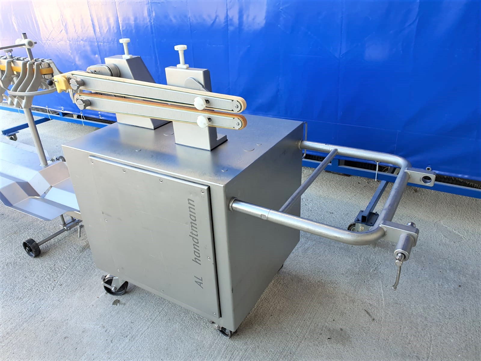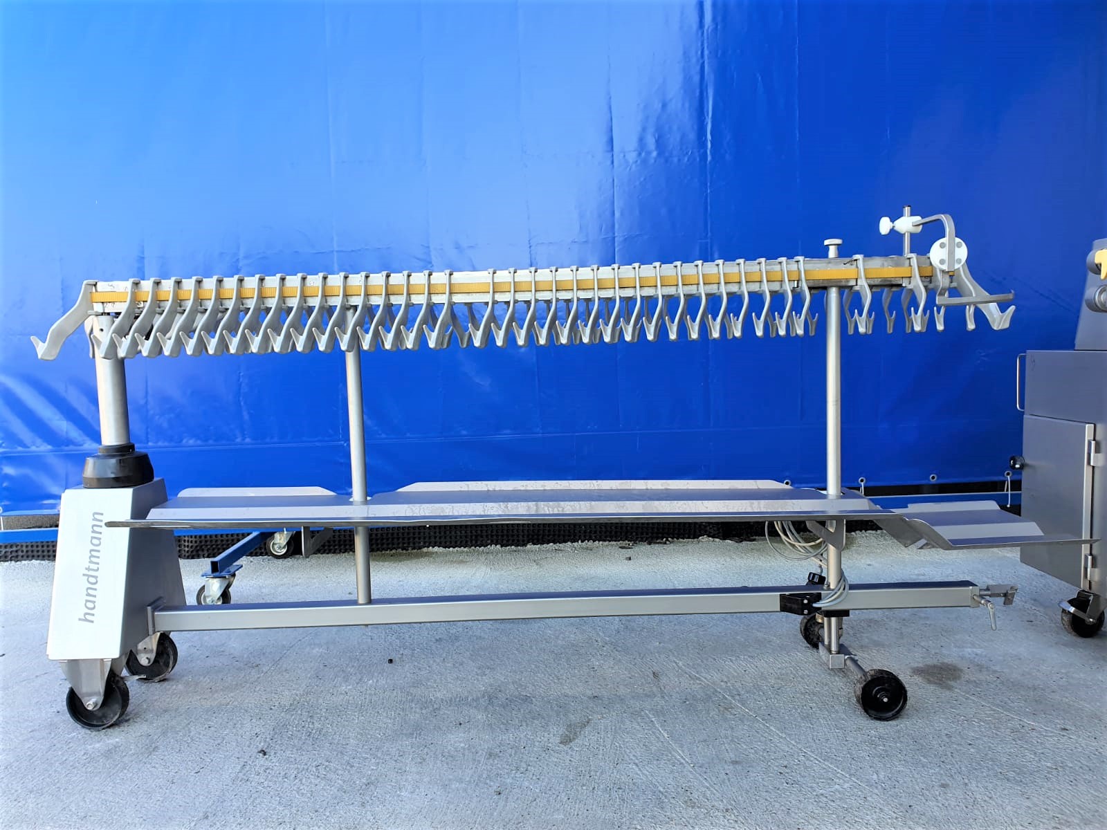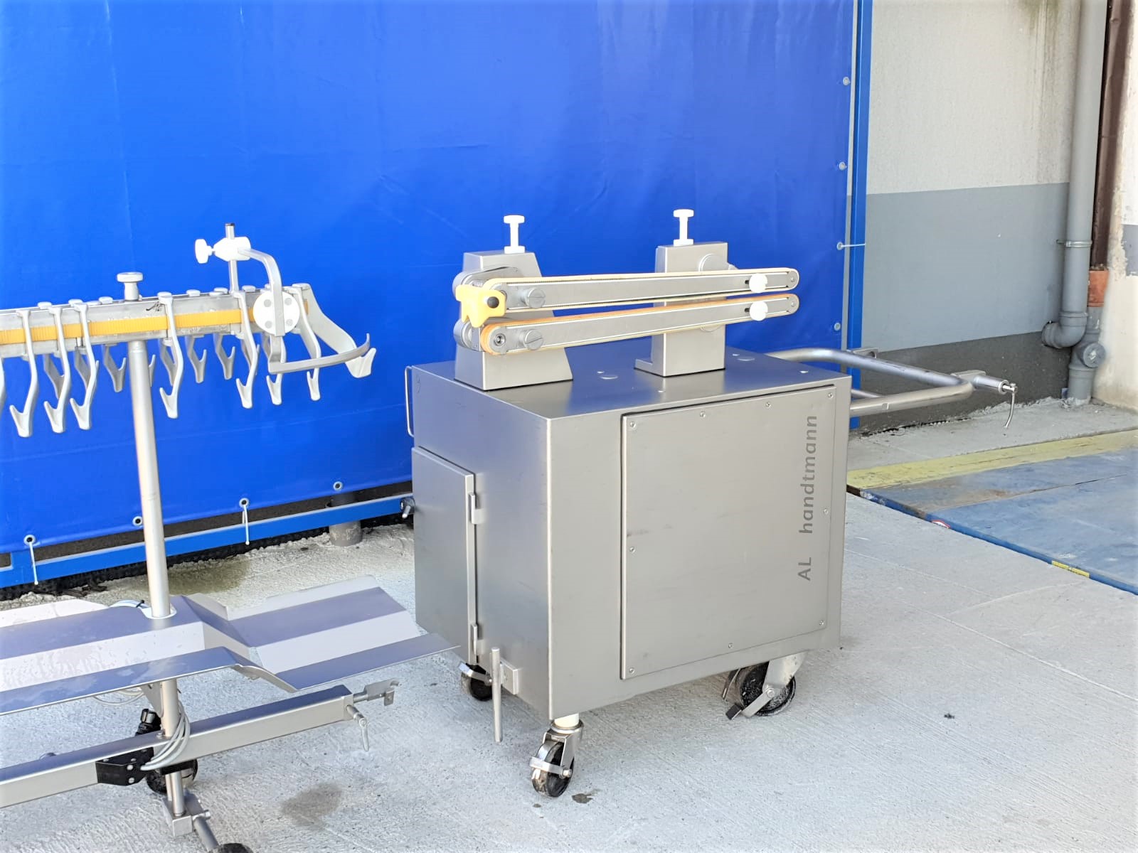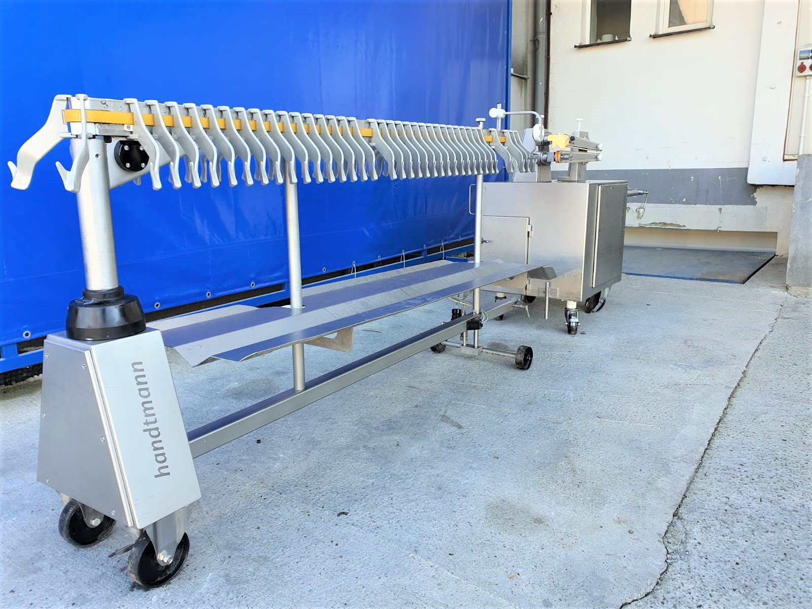 Línea de colgado y torsionado Handtmann AL 216 de segunda mano. Compuesta por el dispositivo de torsión 216-21 y el dispositivo de suspensión 220-16. El PLH 216 coloca las salchichas torsionadas como porciones rectas o curvas, con la posición de torsionado exactamente en el gancho de la unidad de colgado. El número de lazos y el número de porciones por lazo pueden elegirse a voluntad. El diseño estrecho del gancho garantiza una carga óptima de las varillas de ahumado, por lo que los sistemas de ahumado y cocción se aprovechan al máximo, con el consiguiente ahorro de costes y energía.