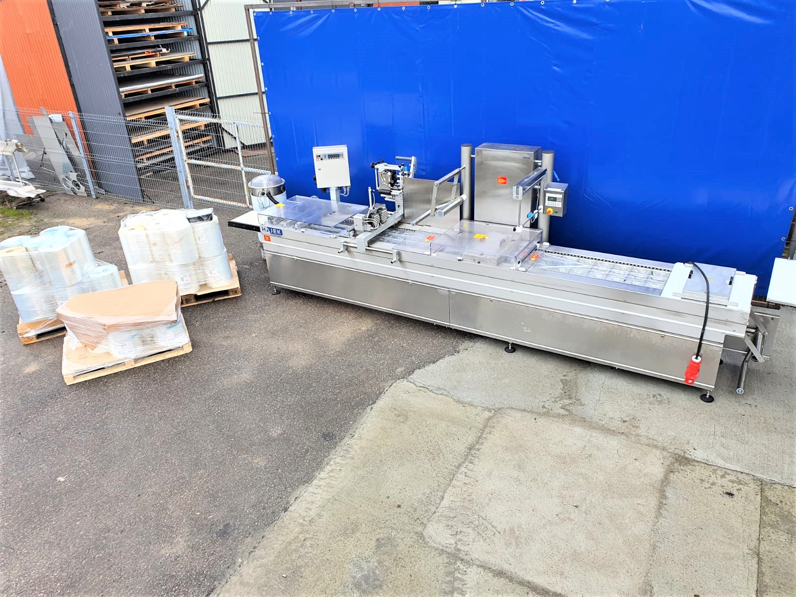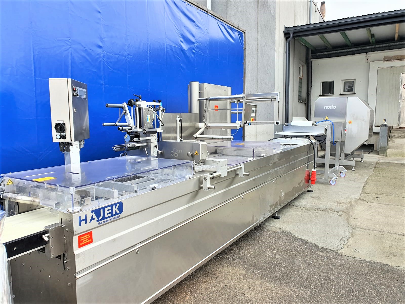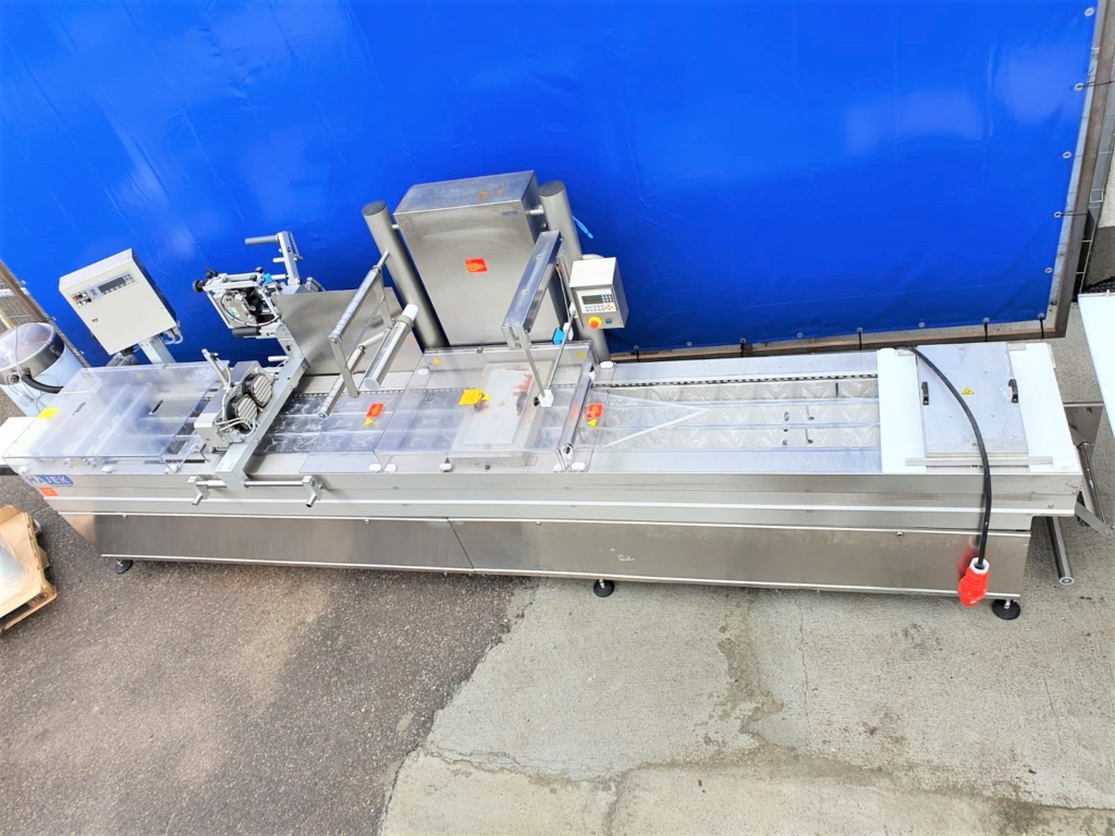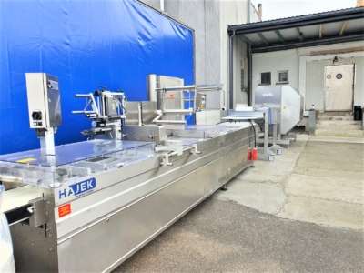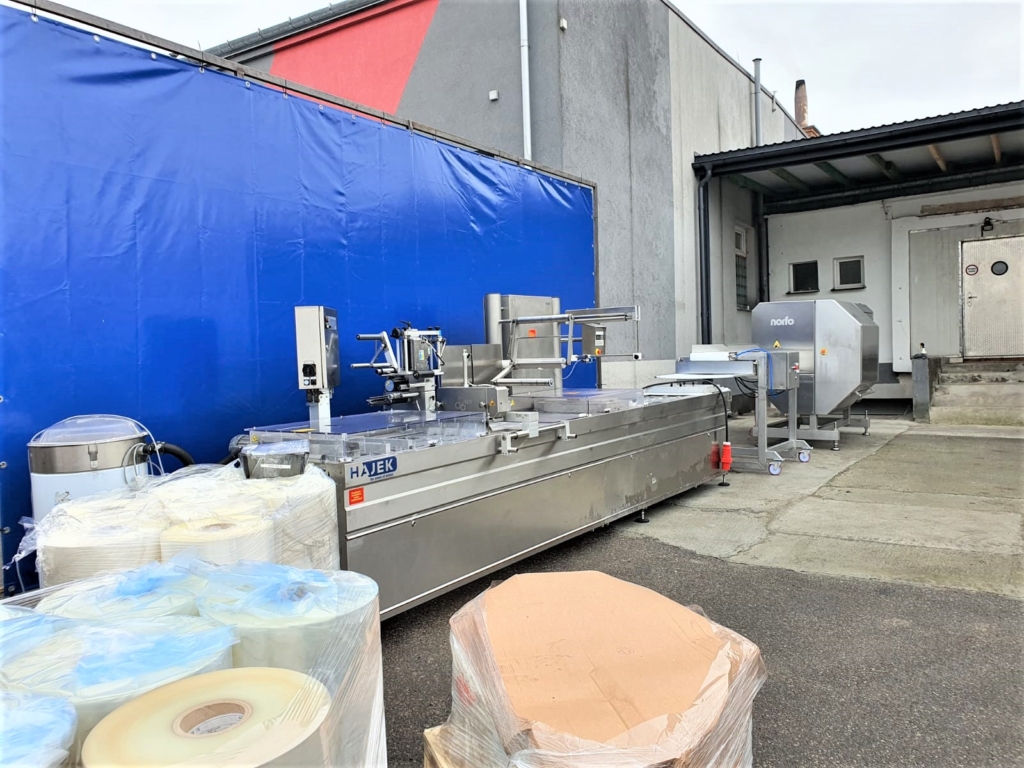 Una línea completa de porcionado y embalaje de productos cárnicos, compuesta por un cortador de porciones Marel (Norfo) B35, una cinta transportadora, una termoformadora Hajek VS30 y una etiquetadora de banda transversal ELS. La línea pesa y mide con precisión (en función de los ajustes) el producto, lo porciona a los valores requeridos y lo transporta a la envasadora, donde tiene lugar el envasado y etiquetado final. El juego incluye un palé de láminas