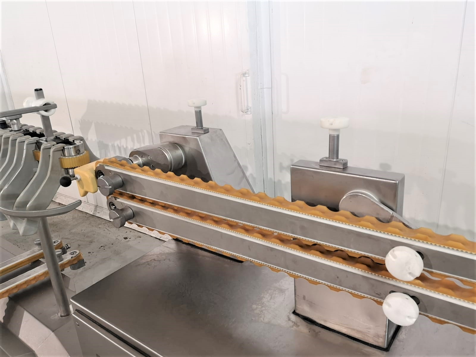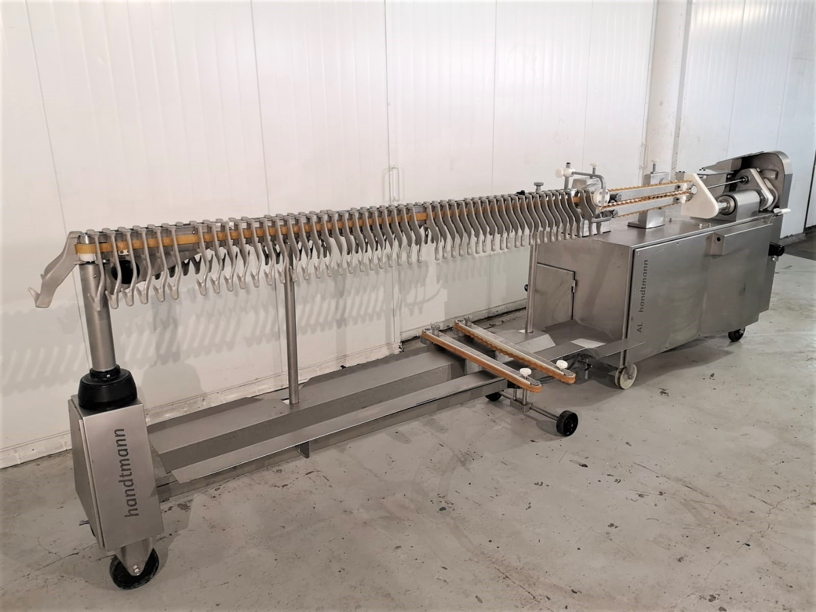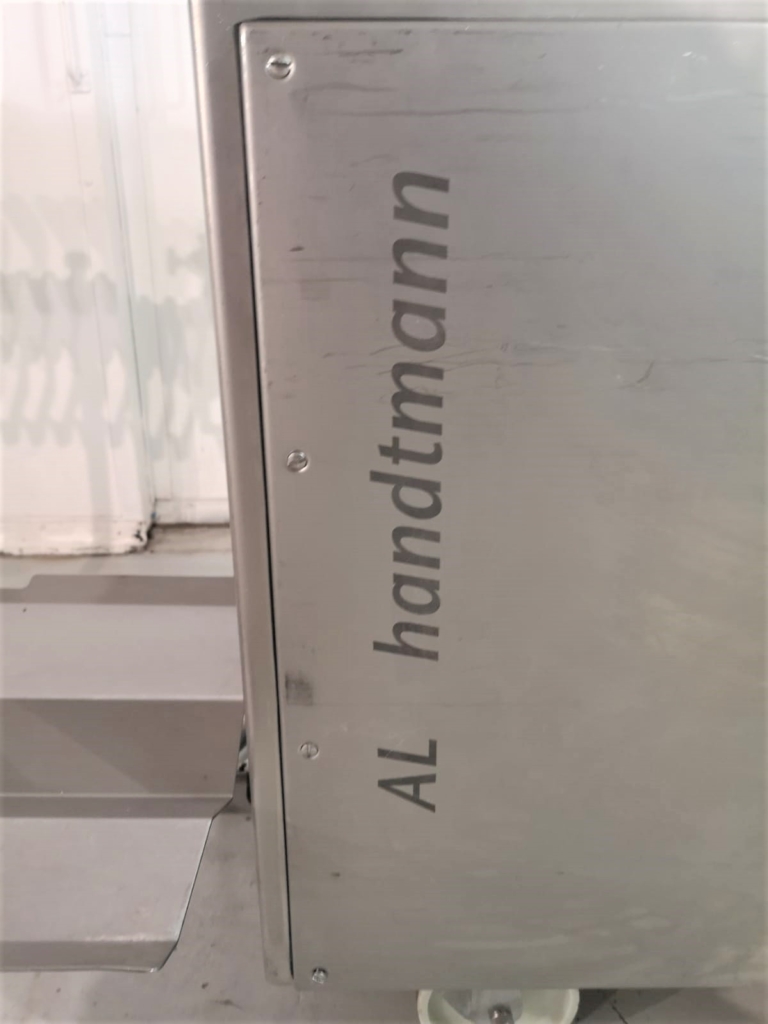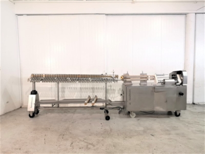 Línea de colgar y enlazar Handtmann AL 216 usada. Compuesta por el dispositivo de torsionado 216-21 y el dispositivo de colgado 220-16. El PLH 216 coloca las salchichas enlazadas como porciones rectas o curvas, con la posición de enlace exactamente en el gancho de la unidad de colgado. El número de lazos y el número de porciones por lazo pueden elegirse a voluntad. Un patrón de gancho estrecho garantiza una carga óptima de las varillas de ahumado y, por lo tanto, los sistemas de ahumado y cocción se aprovechan al máximo, lo que supone un ahorro de costes y energía.