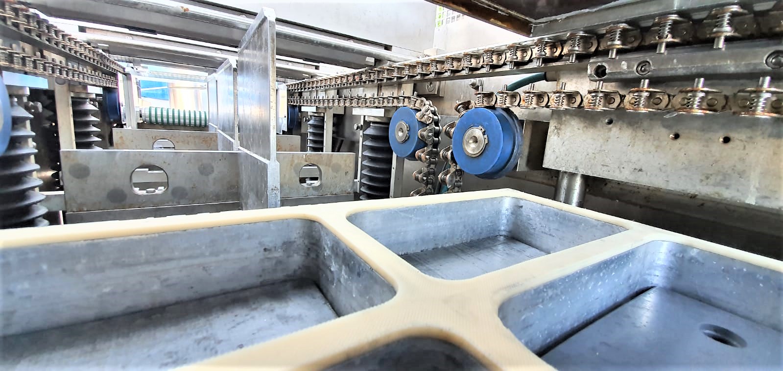 La máquina forma el envase automáticamente a partir de dos láminas, la superior y la inferior. El operador coloca el producto en las celdas hechas con la película inferior. El producto es aspirado automáticamente por un sistema de vacío, sellado, cortado y etiquetado (opcional). La formación de bandejas de diferentes tipos y tamaños se realiza mediante el cambio manual del molde.