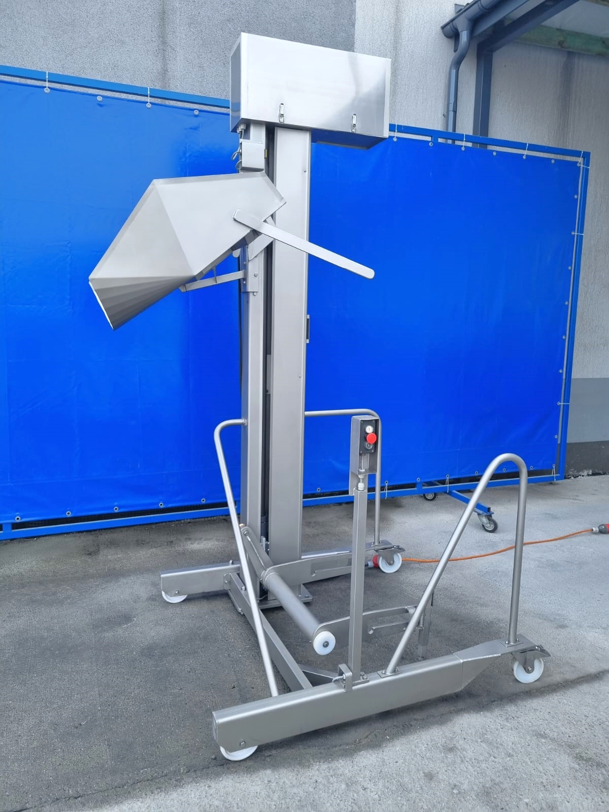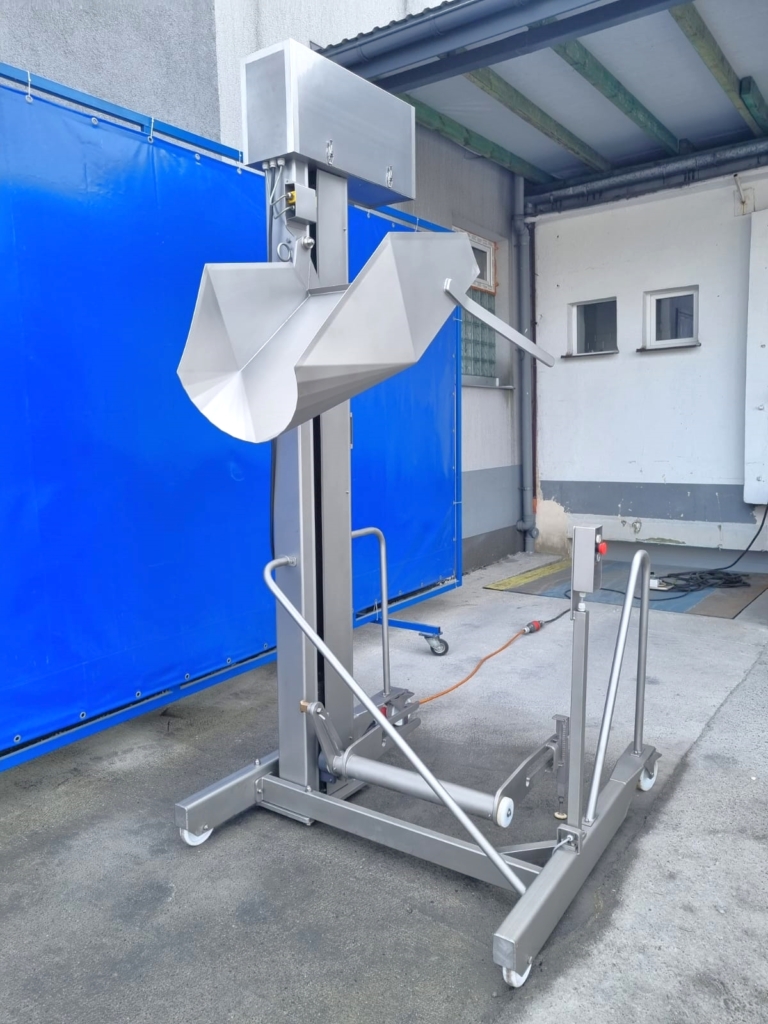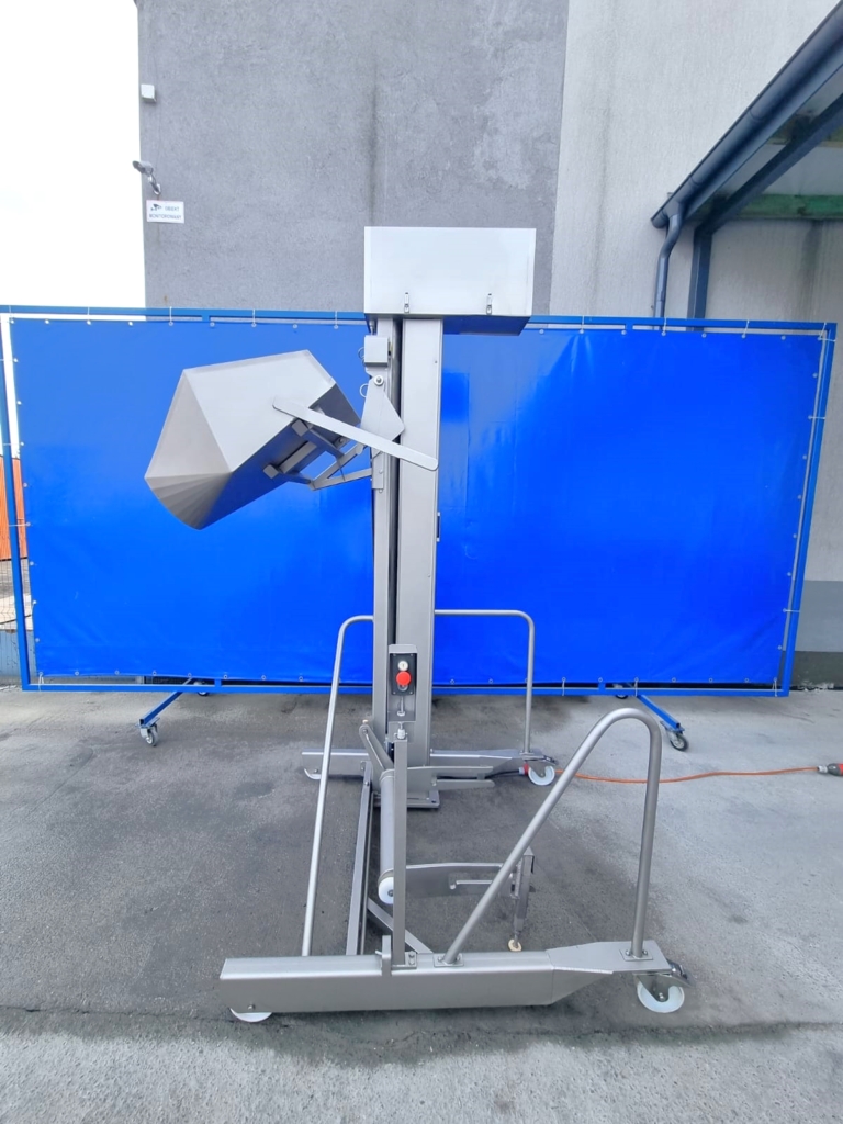 El elevador móvil de segunda mano SFK-Danfotech para contenedores de carne estándar de 200 litros es una solución excelente para transportar el producto a varias máquinas de procesamiento de alimentos. El diseño móvil le permite desplazarse fácilmente y trabajar con varias máquinas simultáneamente.