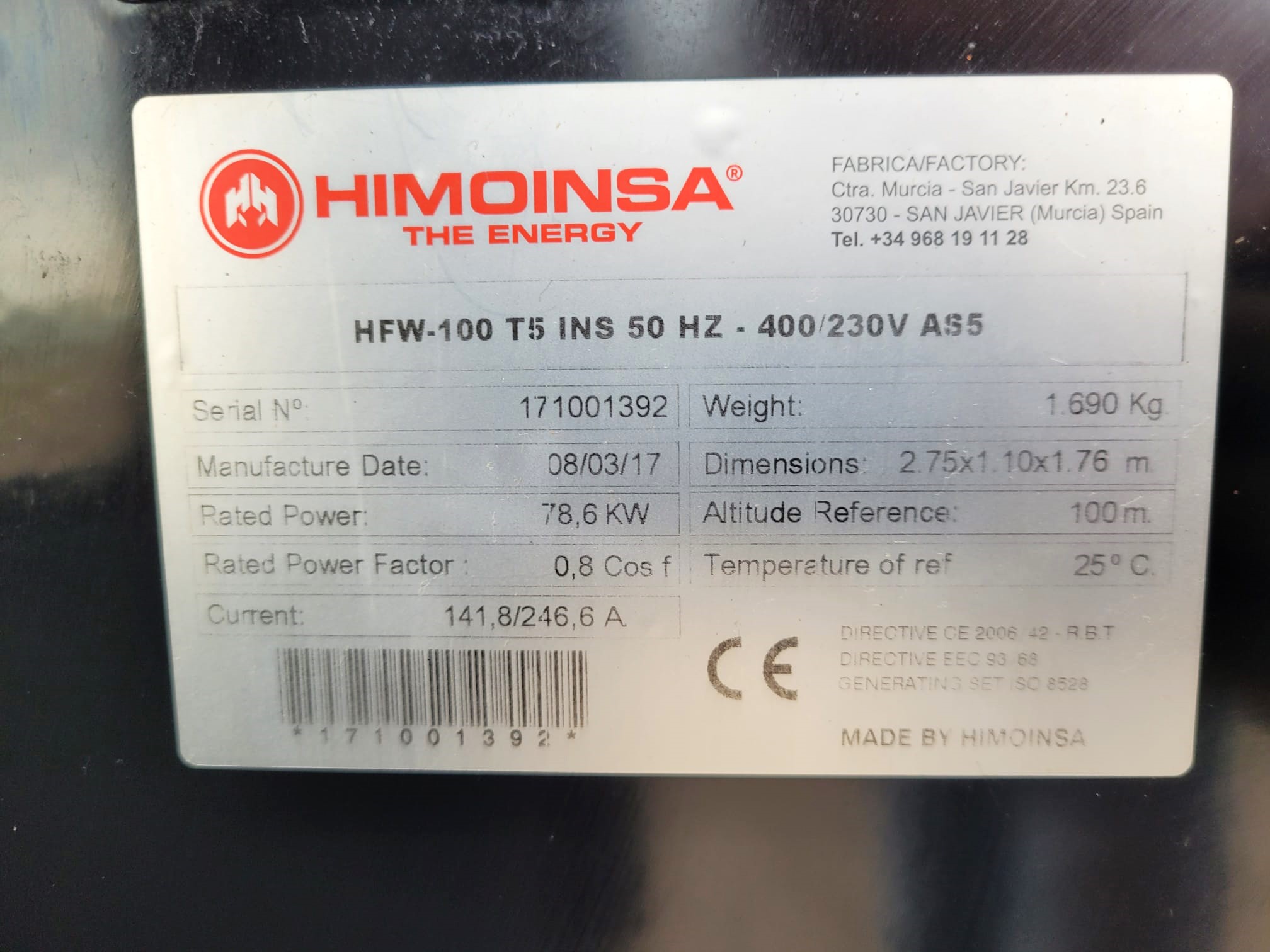 HIMOINSA HFW-100 T5 to agregat prądotwórczy wyprodukowany przez HIMOINSA, znaną firmę specjalizującą się w rozwiązaniach do wytwarzania energii. Model HFW-100 T5 ma moc znamionową 78,6 kW, dzięki czemu nadaje się do różnych zastosowań wymagających niezawodnego i stałego zasilania.