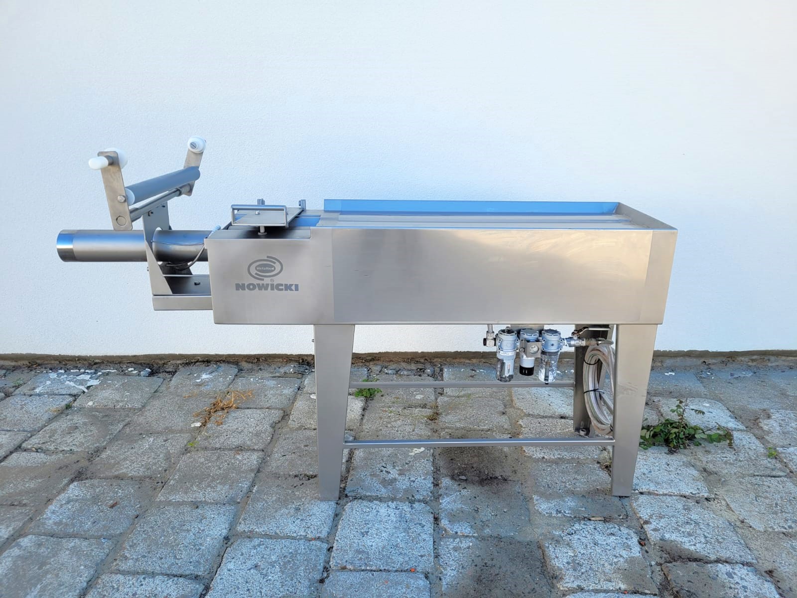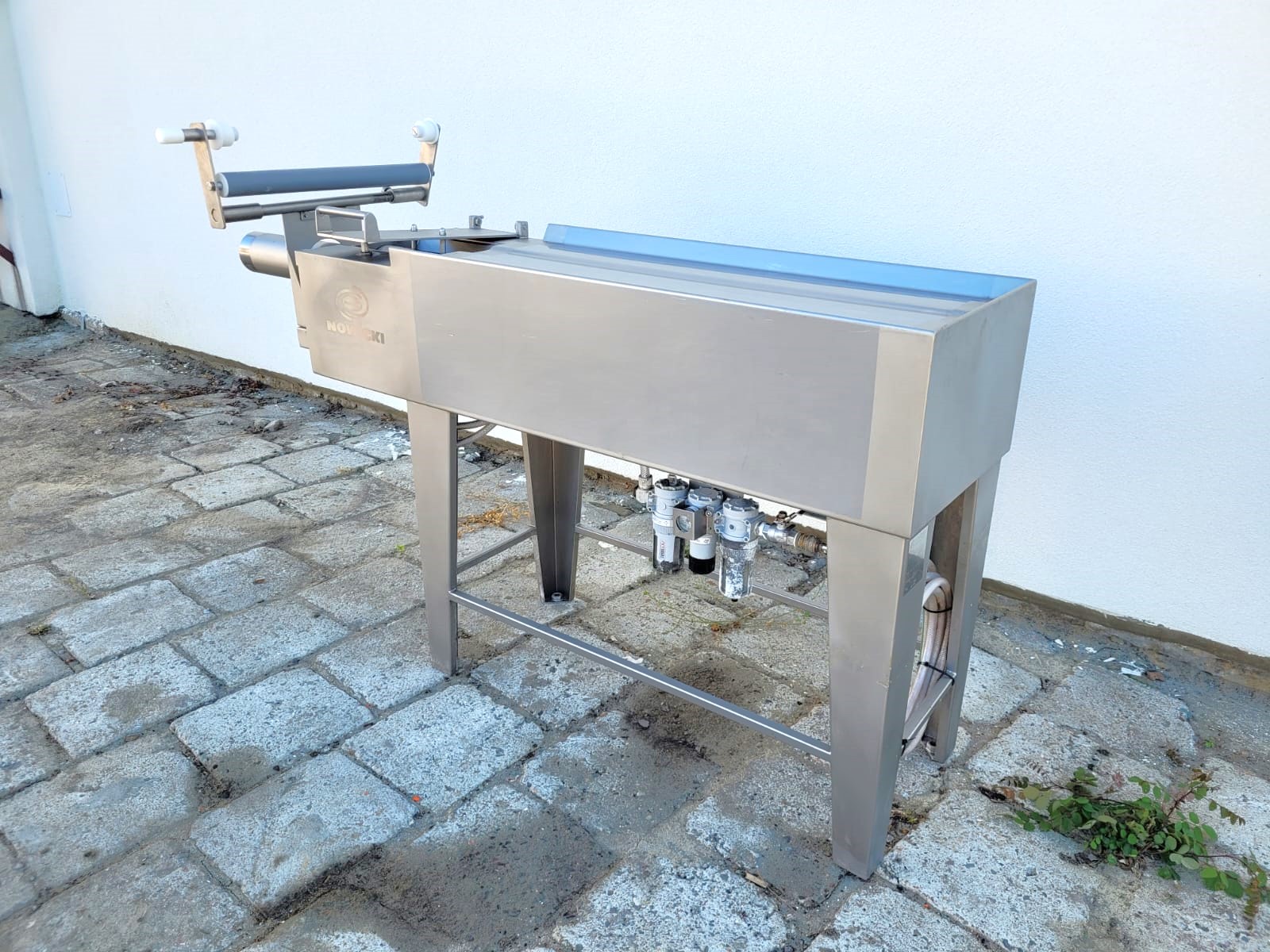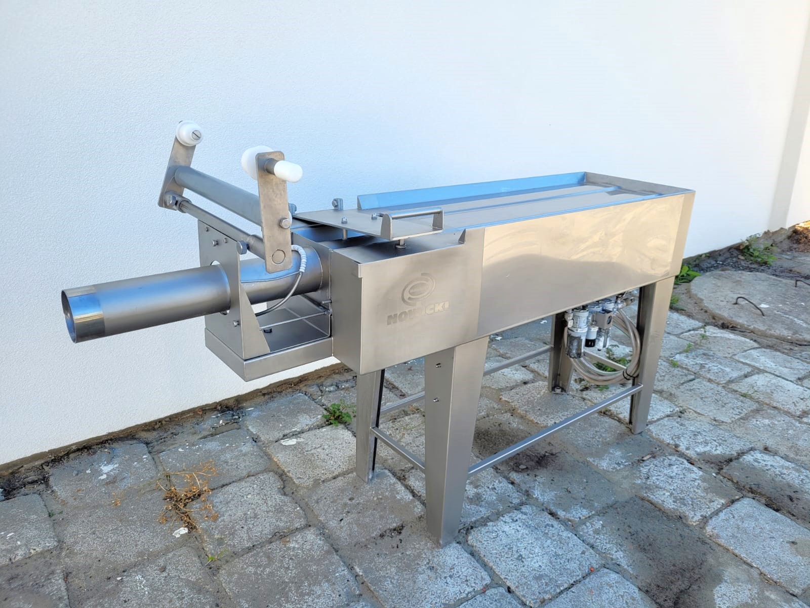 Używana prasa do szynki Metalbud Nowicki NM-2K znacznie ułatwia i usprawnia wprowadzanie szynki lub mięsa do siatki wędzarniczej podczas przygotowywania wędlin. Tłok napędzany jest sprężonym powietrzem.