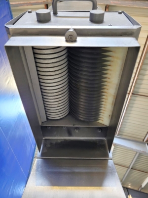 Krajalnica Franz MST 70/160/40 to specjalistyczna przemysłowa krajalnica do mięsa wyposażona w wiele ostrzy, umożliwiająca wydajne i spójne krojenie produktów. Konstrukcja sugeruje możliwość obsługi różnych rodzajów produktów, zachowując jednolitą grubość plastrów. Zapewnia wysoką wydajność, bezpieczeństwo i spójne wyniki operacji krojenia.