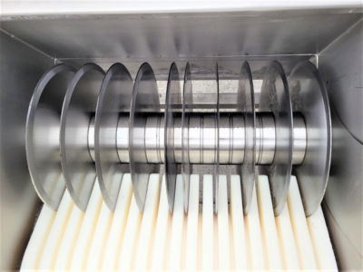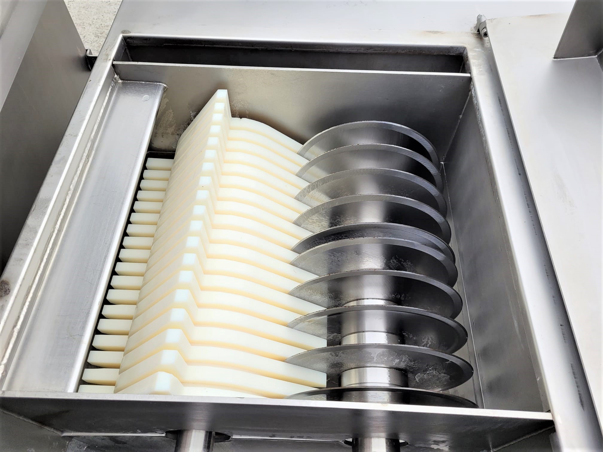 Struktura połączonych ostrzy, składająca się z obrotowego noża gilotynowego i zestawu noży okrągłych, umożliwia obróbkę produktu w różnych temperaturach, tnąc zarówno tłuszcz, jak i mięso.