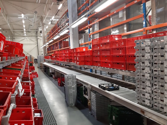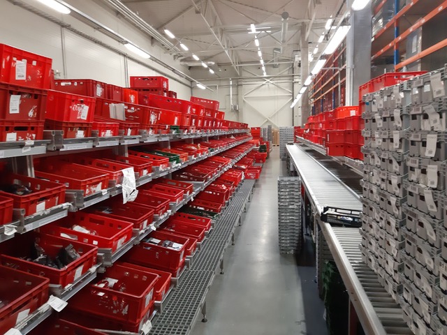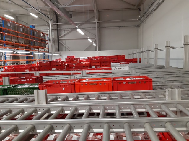 Zona de gravedad: El almacén cuenta con 36 estanterías repartidas en 4 plantas, lo que proporciona 144 „huecos” de carga para cajas E2.
