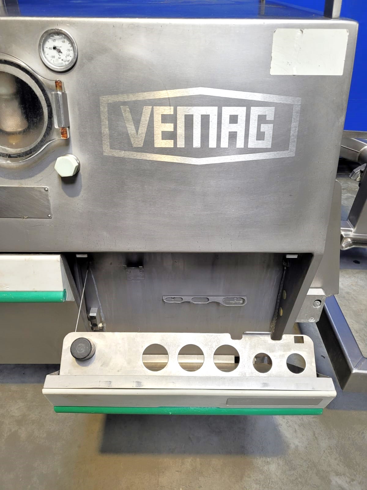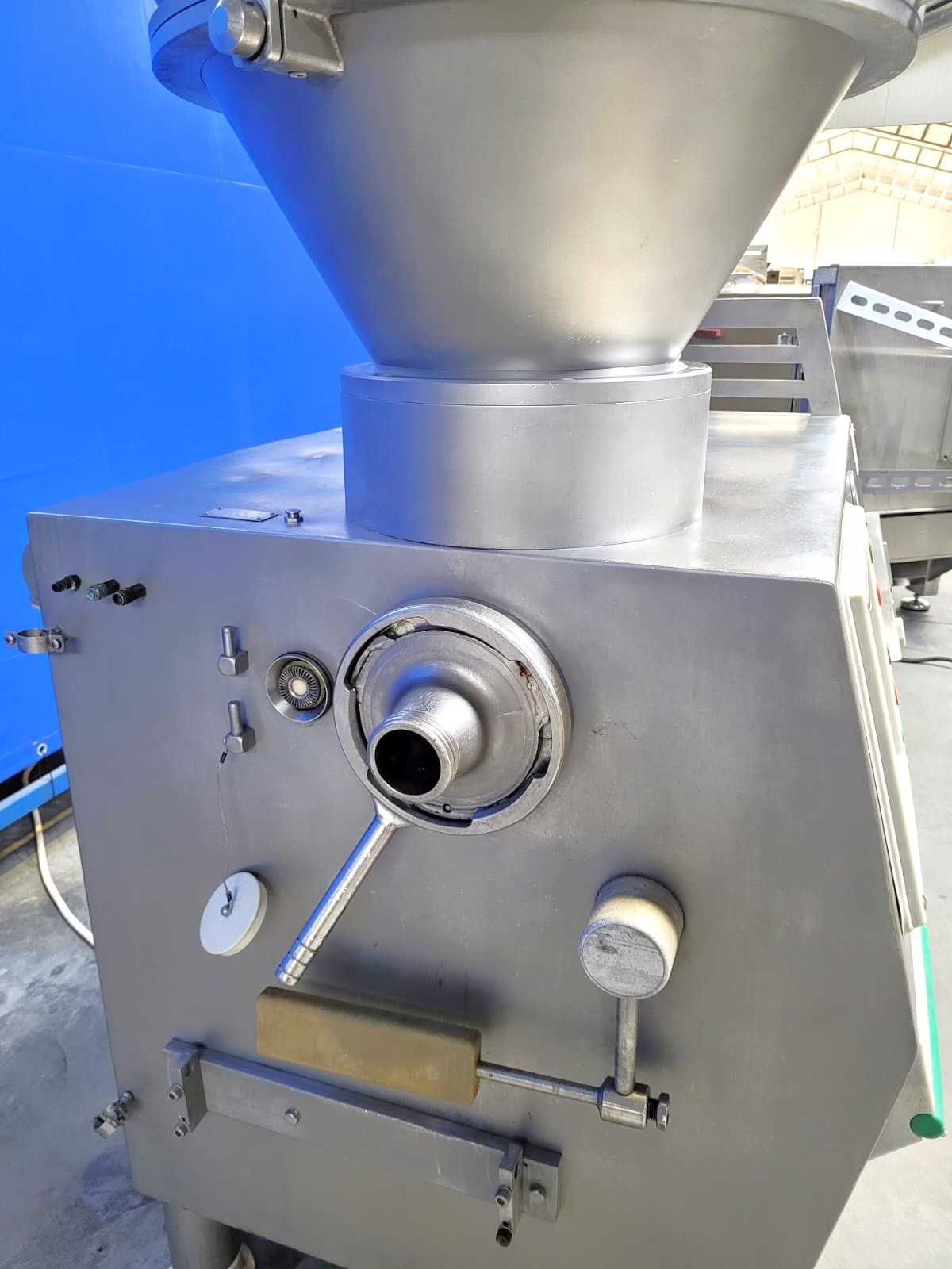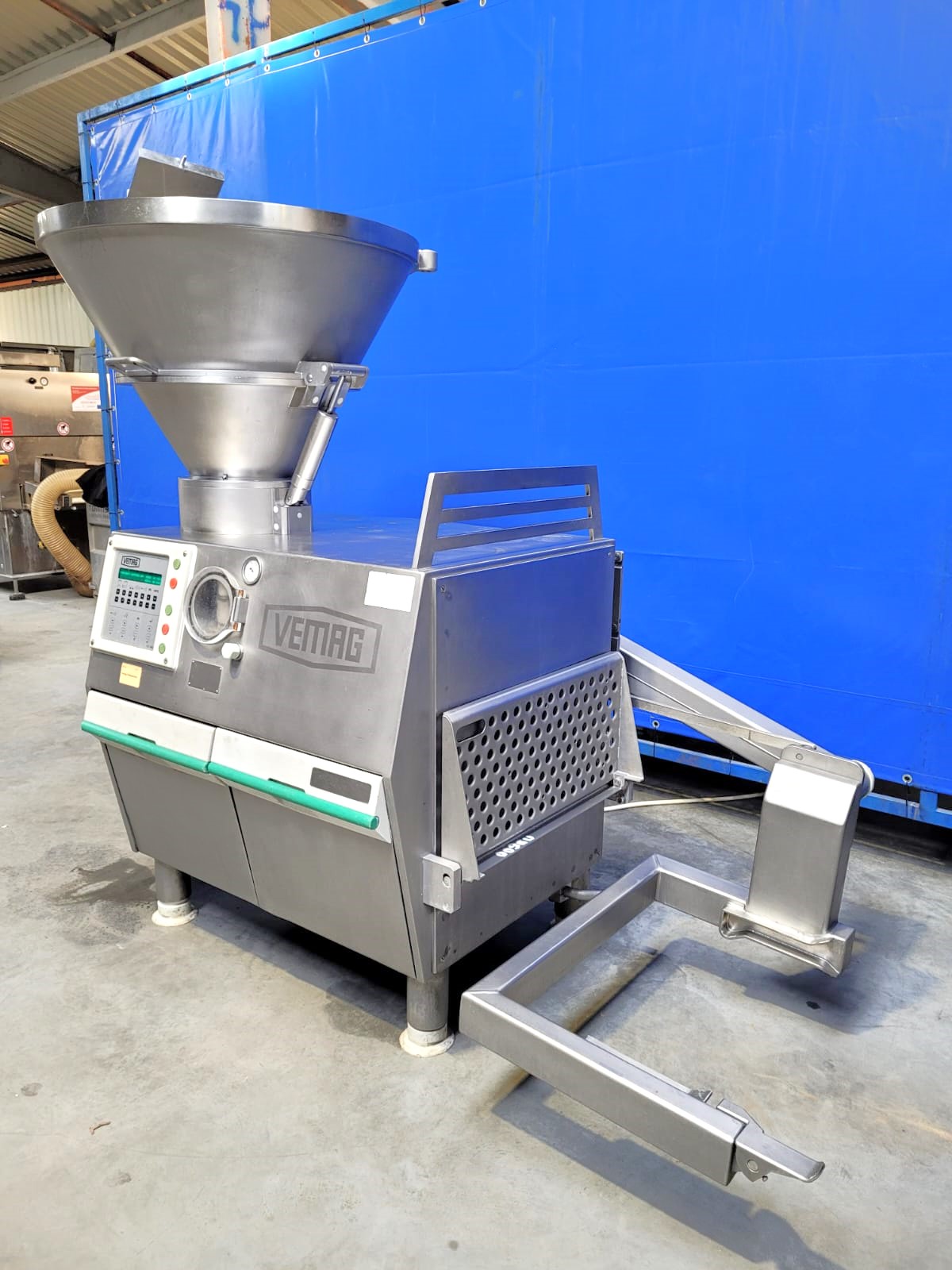 Vemag HP10C to solidna i wszechstronna nadziewarka próżniowa, zaprojektowana z myślą o precyzji i wydajności w średniej wielkości zakładach przetwórstwa spożywczego. Ten używany model jest wyposażony w system załadunku kompatybilny ze standardowymi 200-litrowymi pojemnikami na mięso, zapewniając łatwą integrację z istniejącymi procesami produkcyjnymi. Jedną z wyróżniających się cech HP10C jest podwójny system ślimakowy, który zapewnia delikatny i spójny ruch produktu do wylotu, idealny do utrzymania jakości i tekstury produktu.