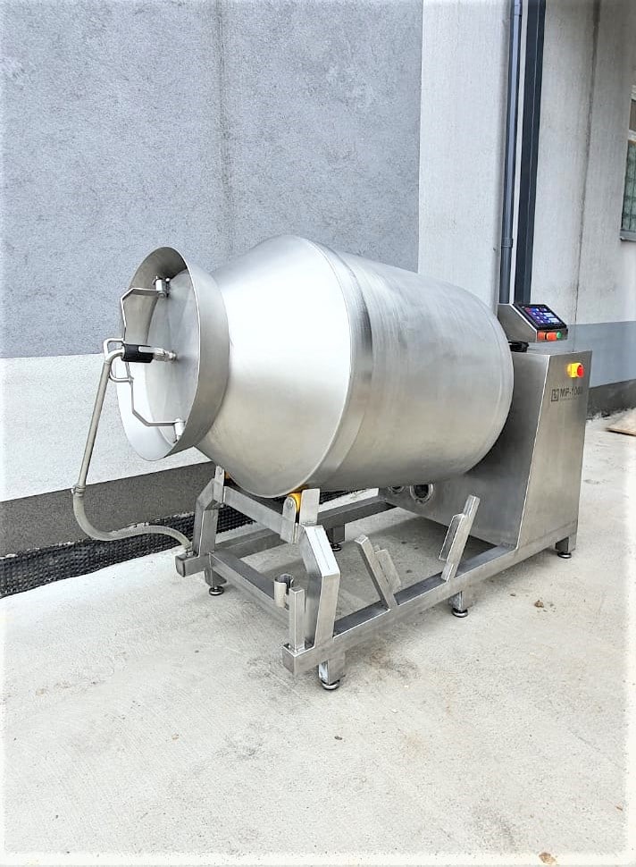 Używana masownica próżniowa o pojemności 1000l. Masownica próżniowa stosowana jest w zakładach przetwórstwa mięsnego do marynowania i masowania mięśni i elementów mięsa czerwonego, elementów drobiowych czy owoców morza. Podstawowym atutem masownicy jest próżnia pulsująca, która powoduje rozciągnięcie mięśnia i większe wchłanianie solanki peklującej, przypraw czy marynaty.