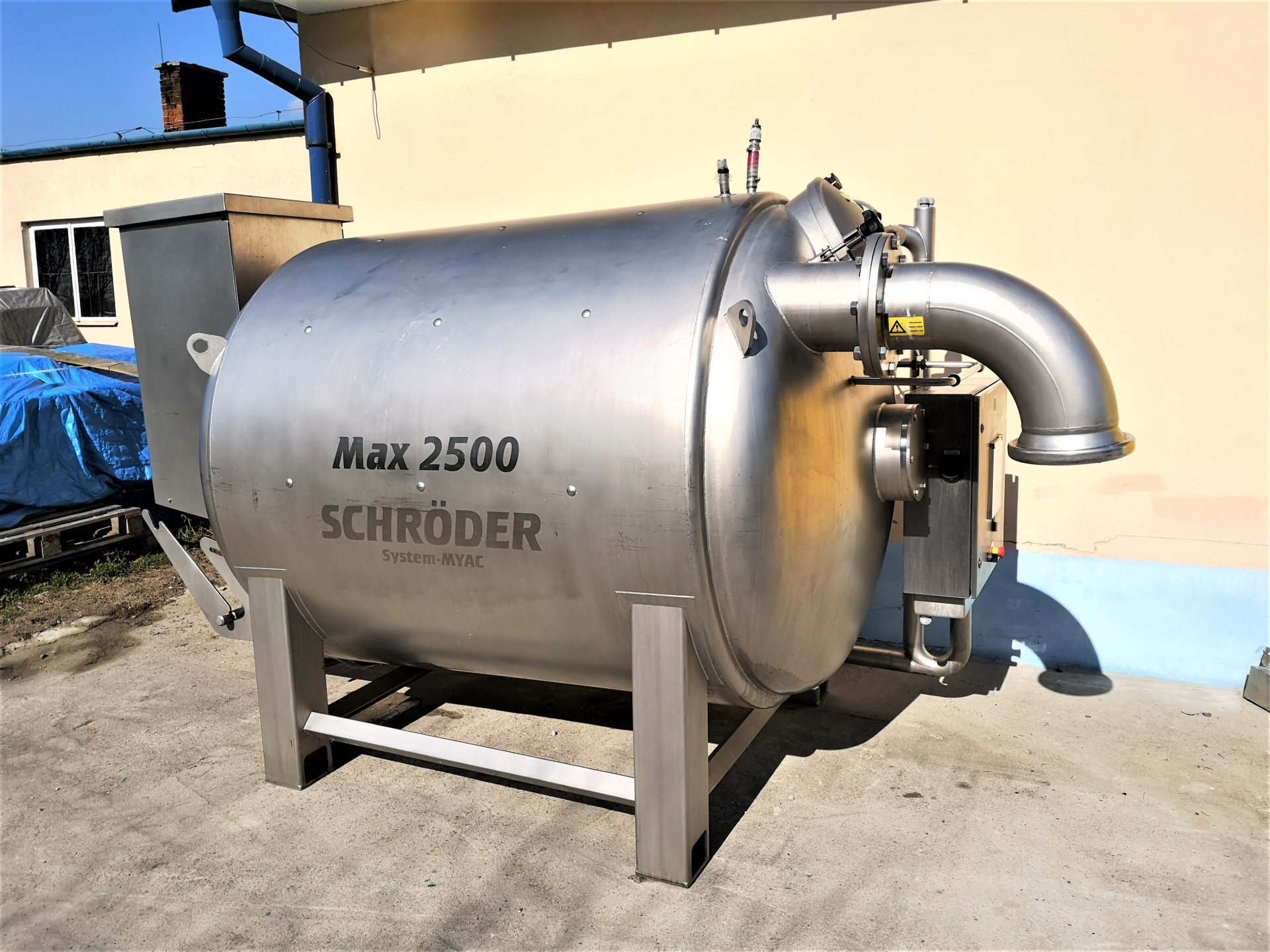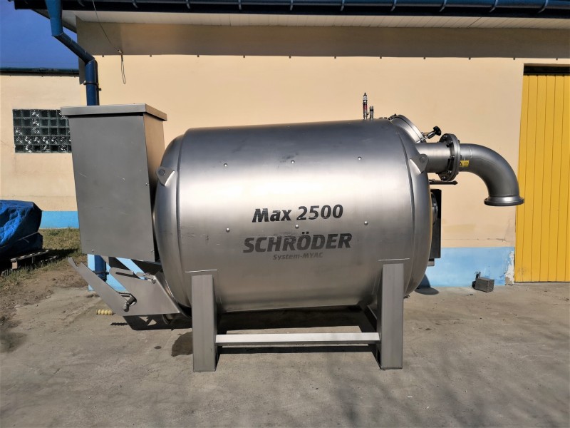 Masownica Próżniowa Schröder MAX 2500 o pojemności do 2500kg produktu. MAX 2500 jest stosowany w przetwórstwie wołowiny, wieprzowiny i drobiu. Mieszadło z czterema ramionami mieszającymi zapewnia optymalne mieszanie i równomierny efekt masowania. Ładowanie odbywa się z przodu, a rozładunek z tyłu, co oznacza, że masownica idealnie nadaje się do pracy w linii technologicznej.