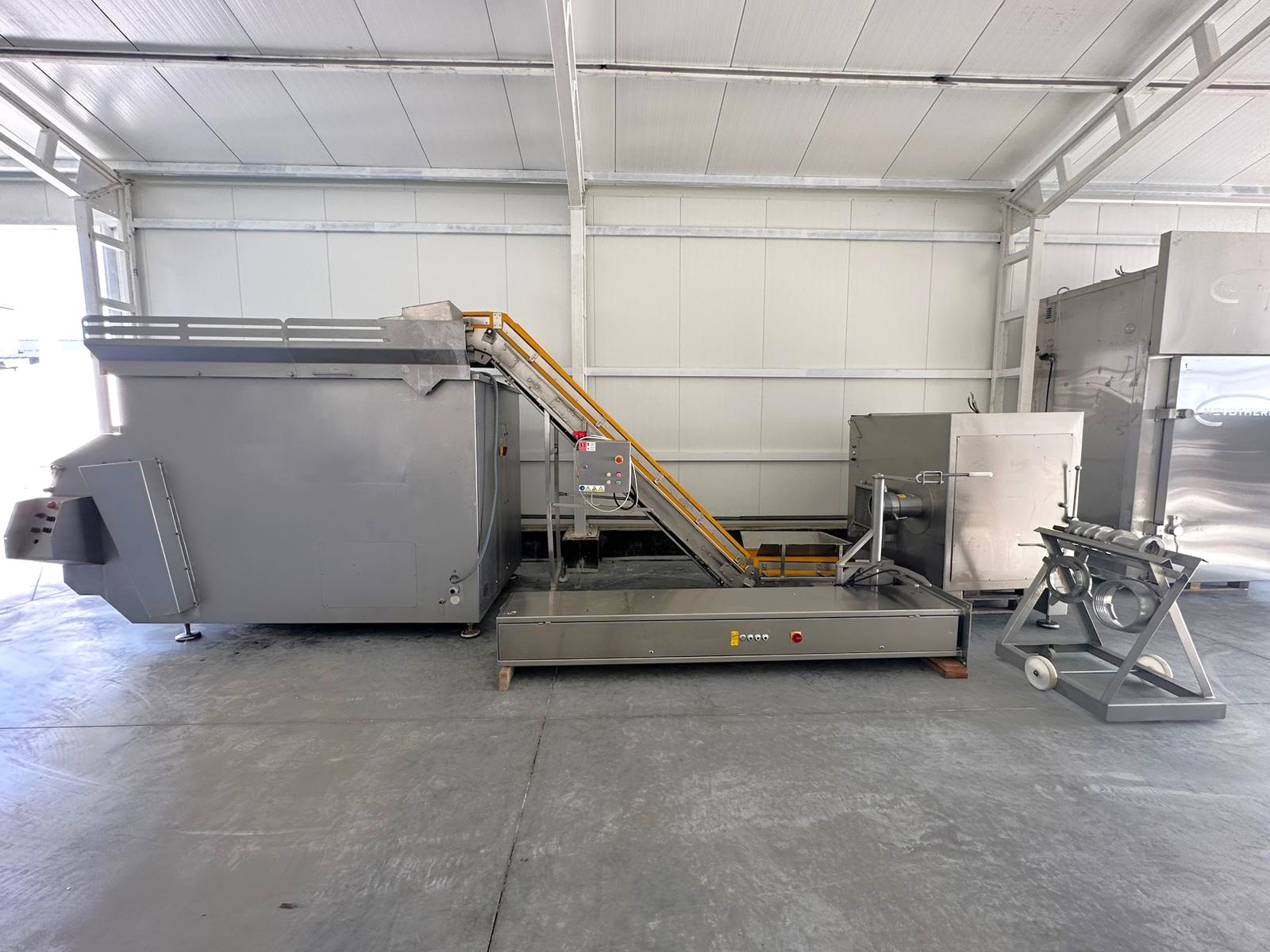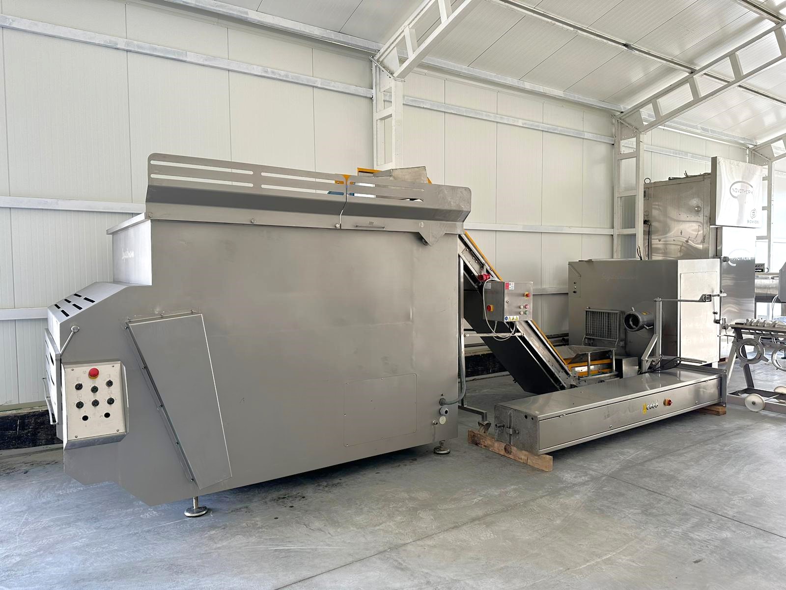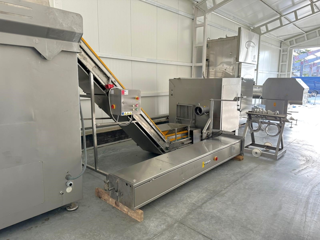 Używana linia mielenia i mieszania Seydelmann to system przemysłowy przeznaczony do wydajnego przygotowywania mielonych produktów mięsnych. Obejmuje wydajny wilk masarski, urządzenie podnoszące, przenośnik transportowy i mieszalnik, które współpracują ze sobą w celu osiągnięcia najwyższej jakości pożądanych produktów.