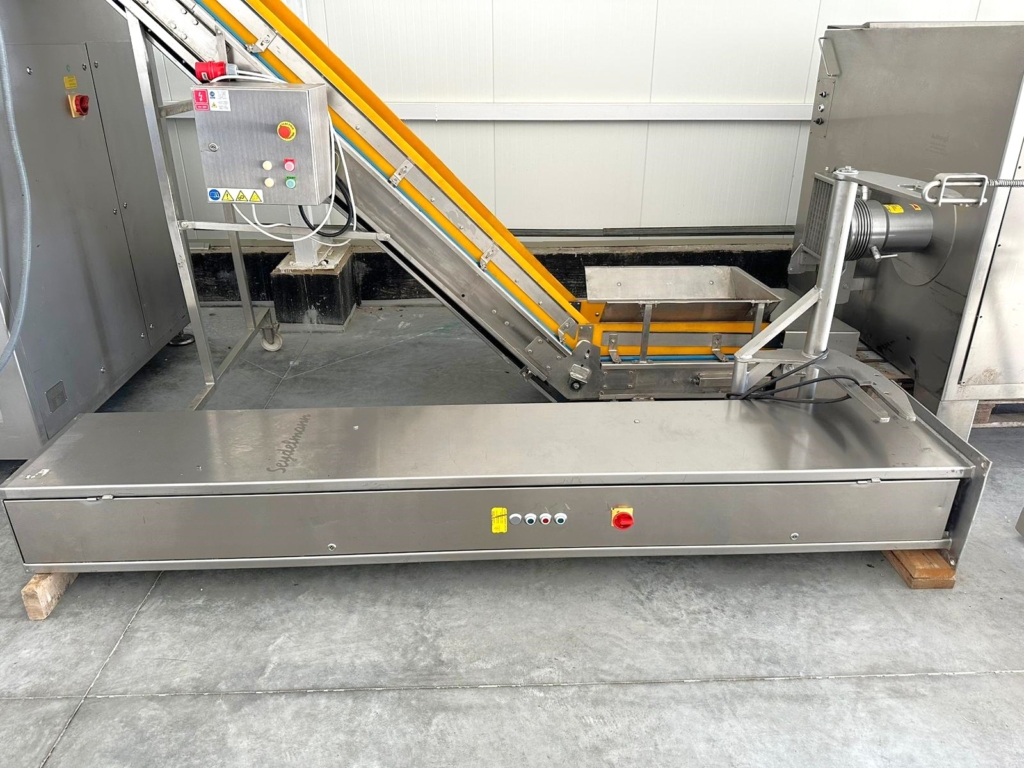 Moc: 55 kW - Przenośnik taśmowy model: PTB-Z służy do transportu mięsa z wilka do mieszalnika. Pomaga utrzymać ciągły i zautomatyzowany przepływ mięsa przez linię przetwórczą.