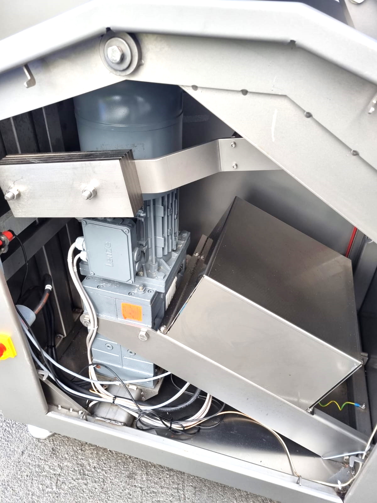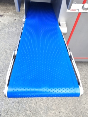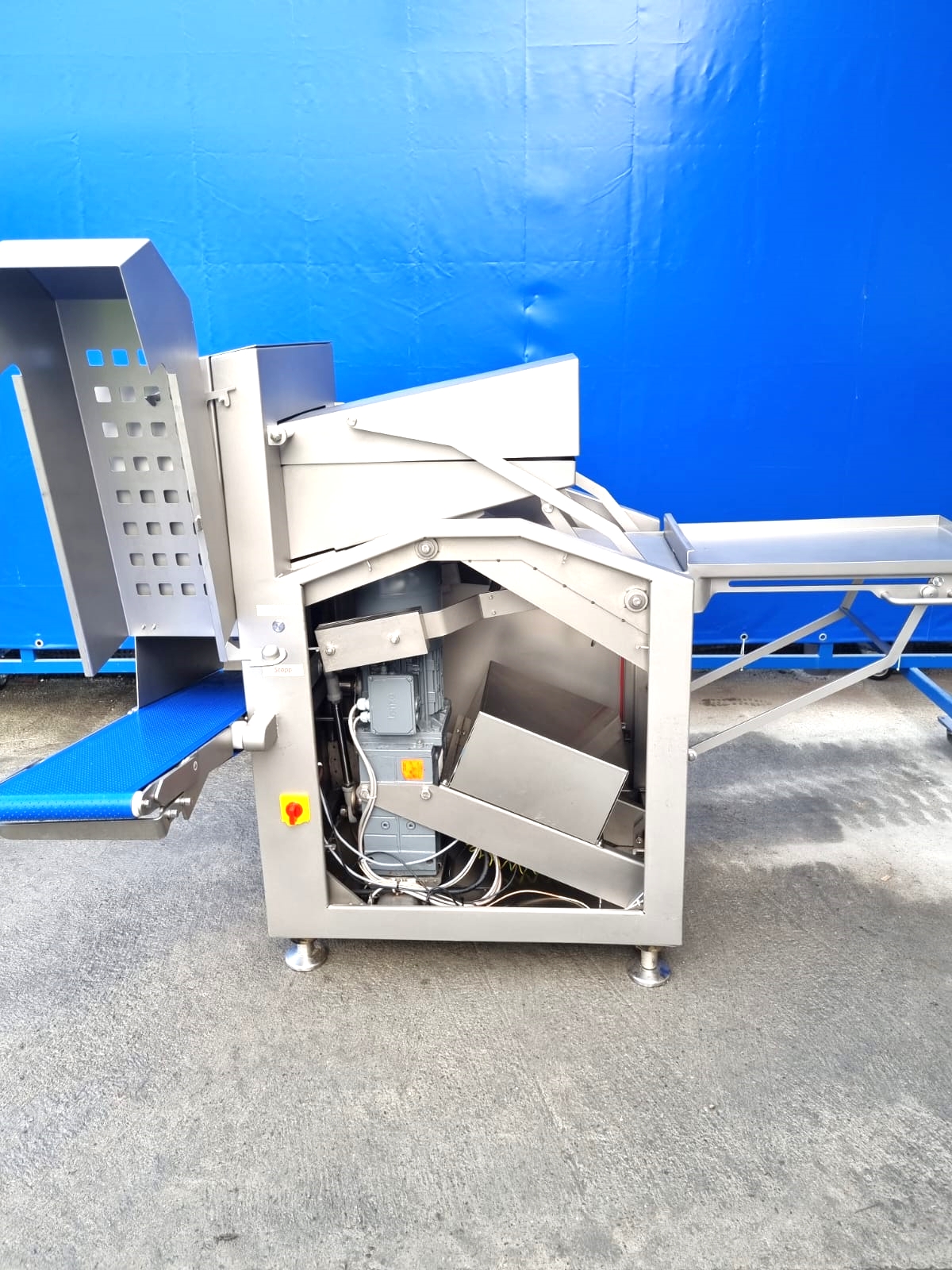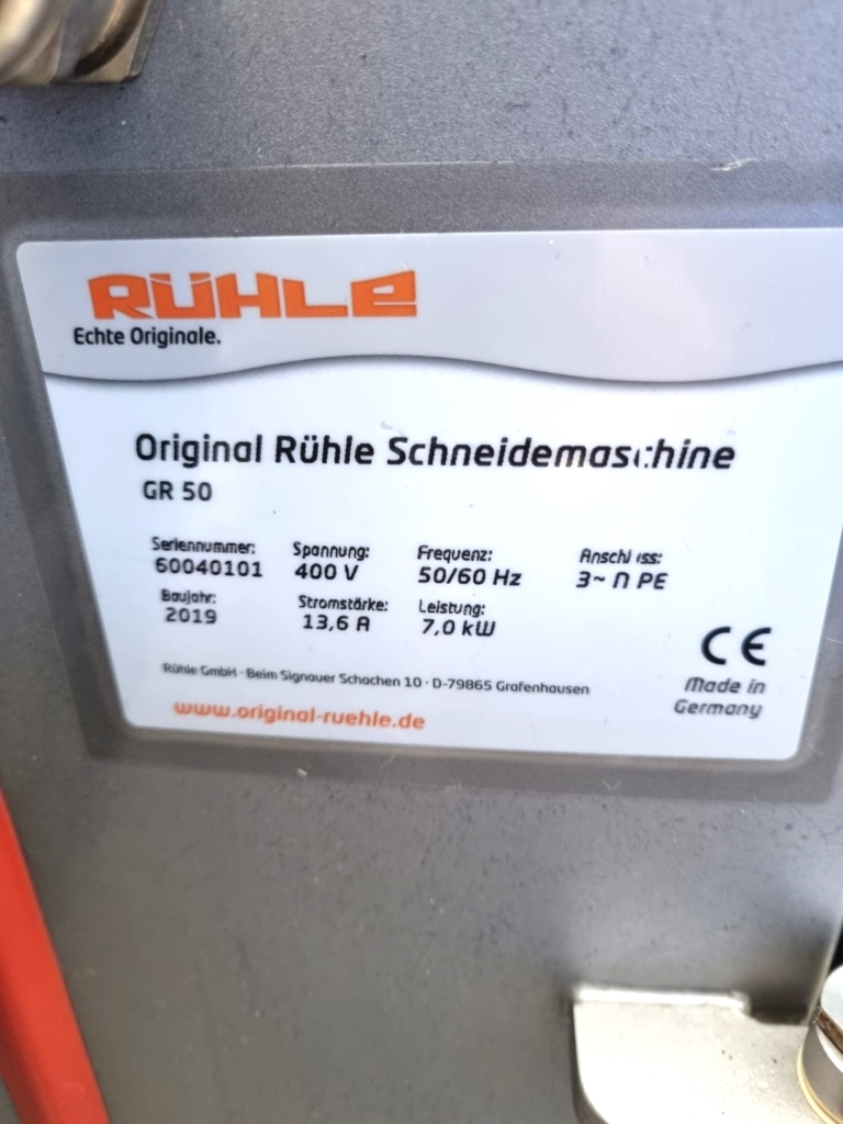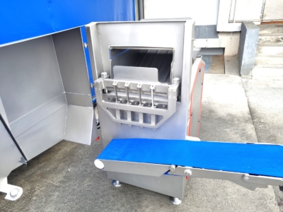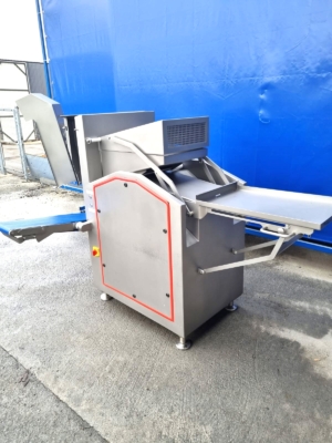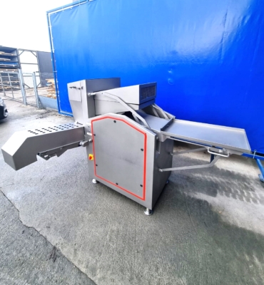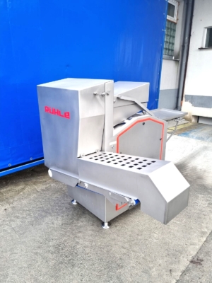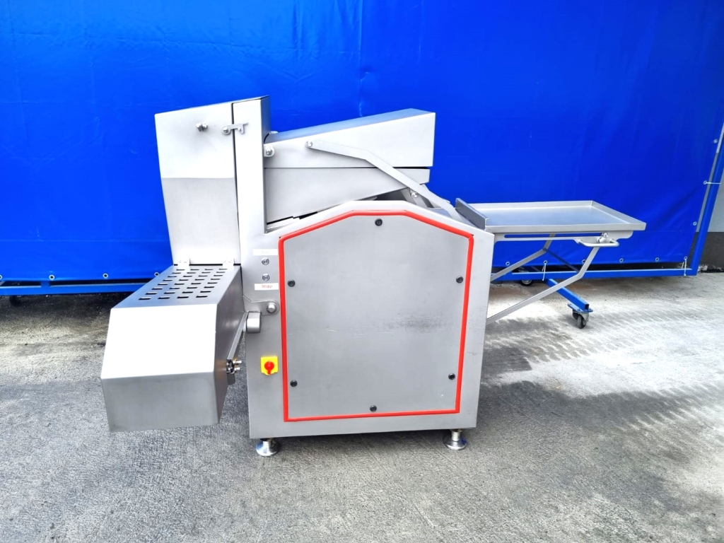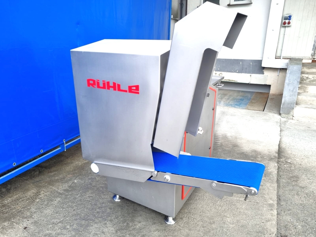 Używana gilotyna Ruhle GR50 jest wyposażona w poziomy nóż, który może łatwo ciąć pół- lub głęboko mrożone produkty, takie jak mięso, ryby, warzywa lub masło. Nóż tnie plastry o grubości 30mm, 45 razy na minutę. Cztery pionowe ostrza dzielą plastry na kawałki o szerokości 90 mm, które są wyrzucane przez taśmę transportową. Model ten wyposażony jest w składany stół roboczy i system podnoszenia.