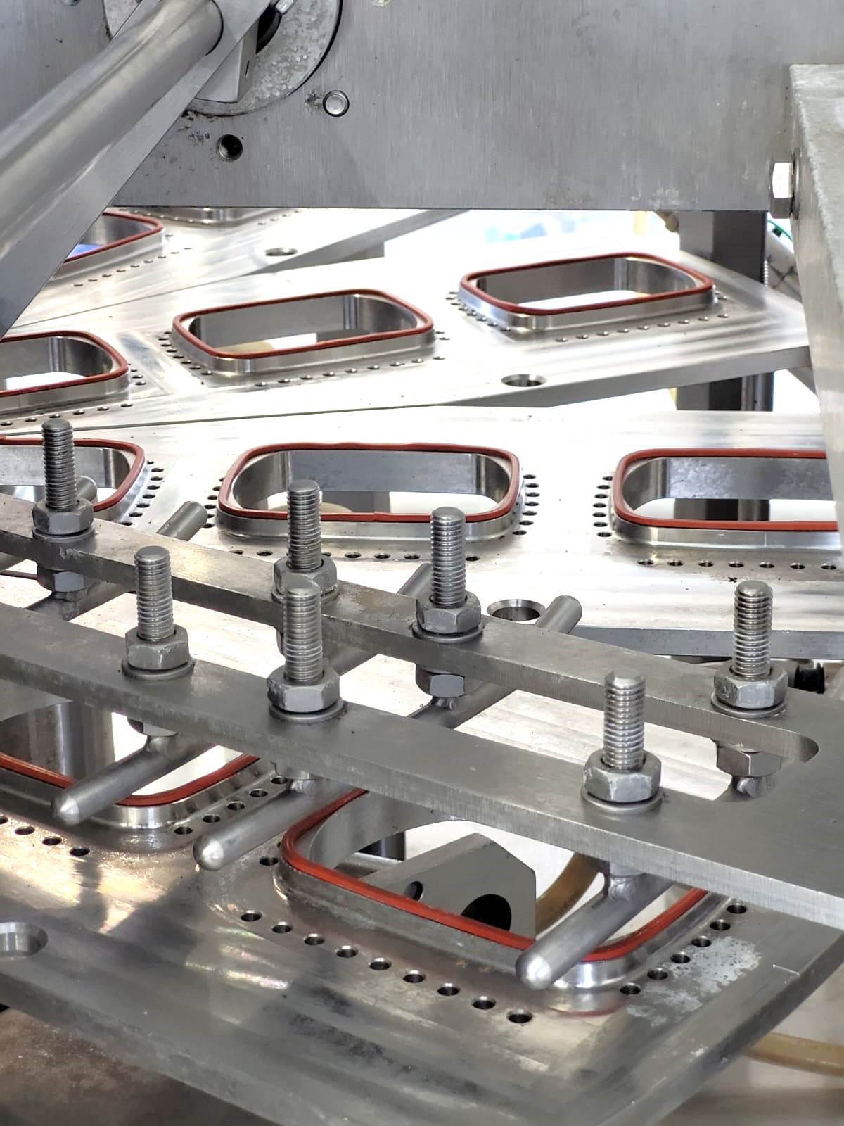 Silnik, pompa i inne ruchome komponenty są zabezpieczone i zainstalowane w ramie maszyny, pod blatem stołu.