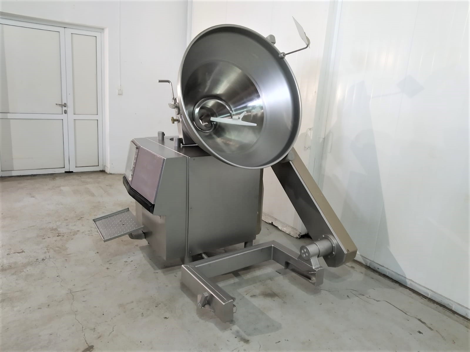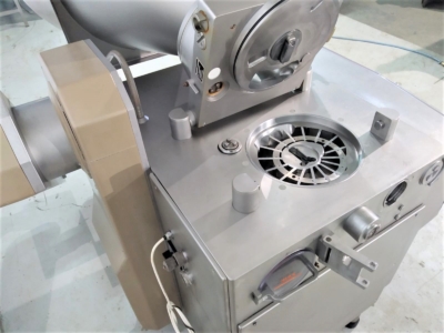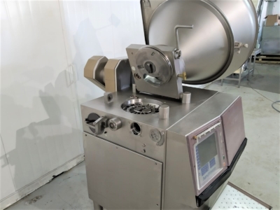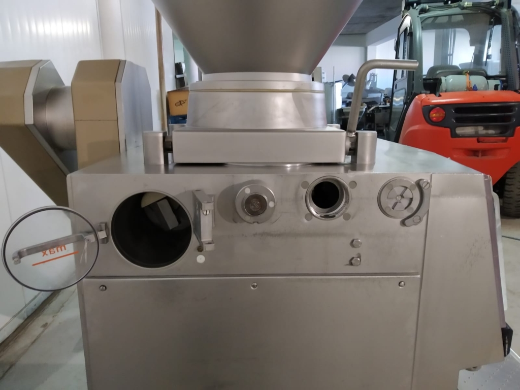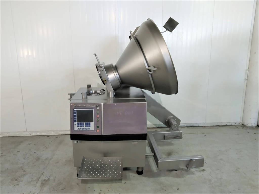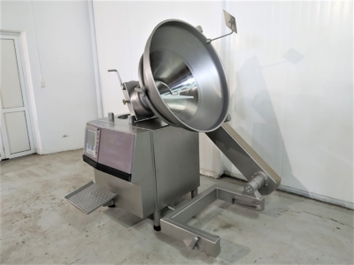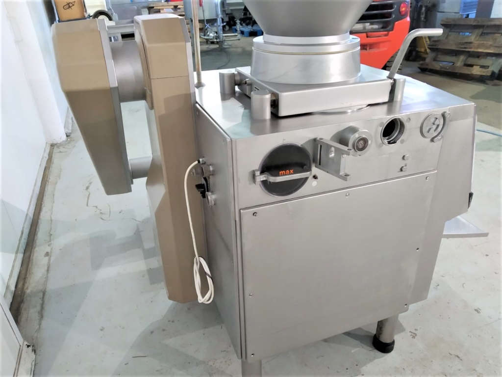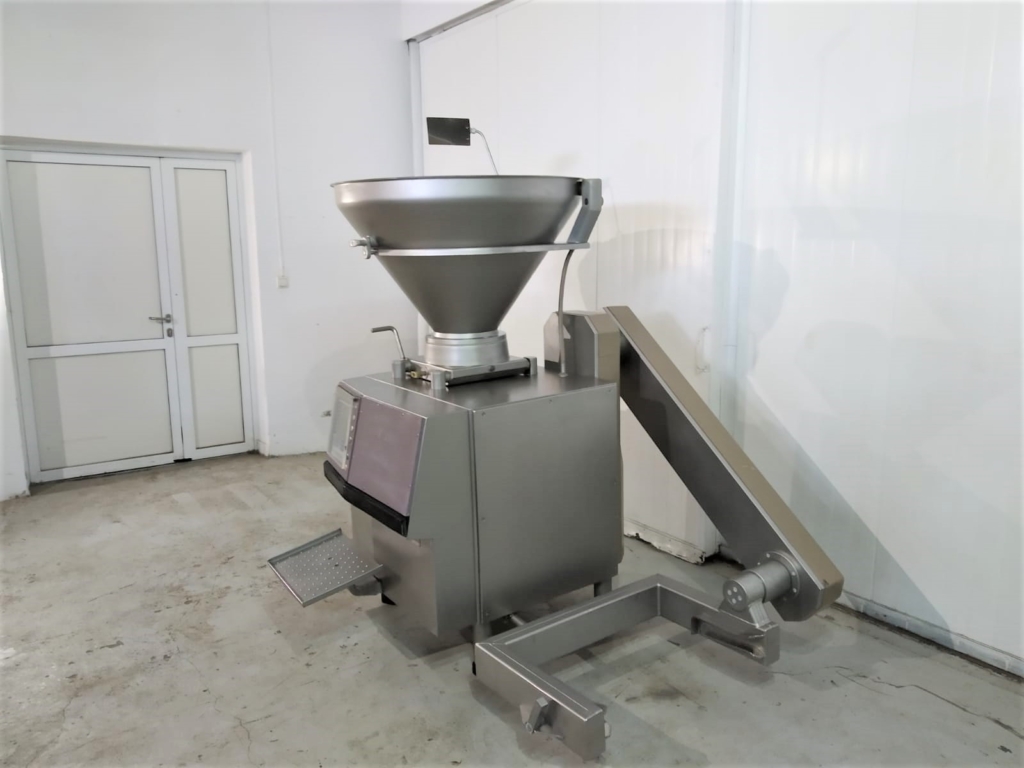 Nadziewarka Handtmann VF200B, wyposażona w mechanizm okręcarki, przygotowana pod głowicę wilkującą Handtmann GD 93-3. Maszyna posiada zintegrowany załadunek do standardowych 200l pojemników.