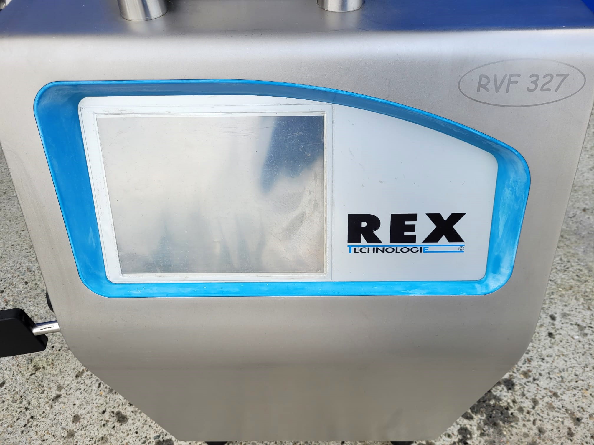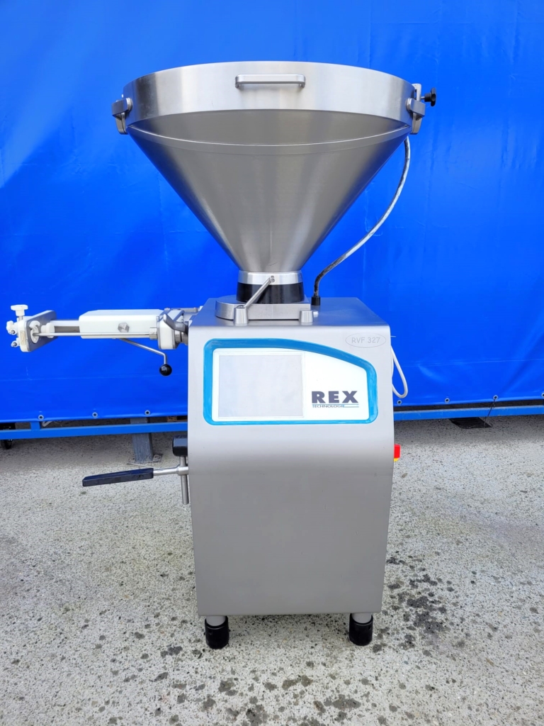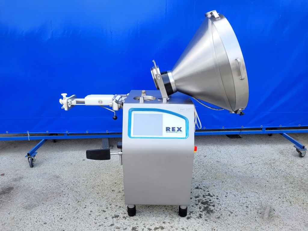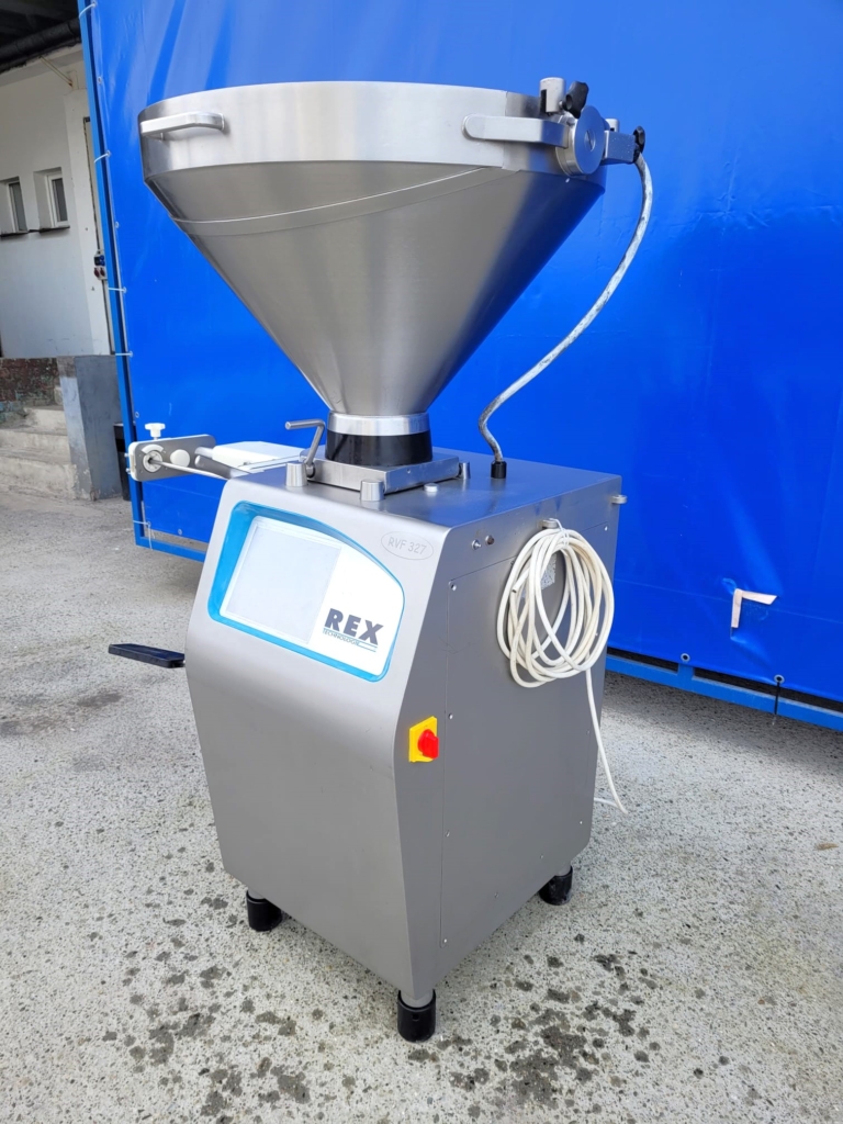Nadziewarka próżniowa REX Technologie, model RVF 327. Przeznaczona do małych i średnich przedsiębiorstw, które produkują rożne ilości i asortymenty kiełbas. Nadziewarka wyposażona jest w sterowanie dotykowe, podtrzymkę i okręcarkę.