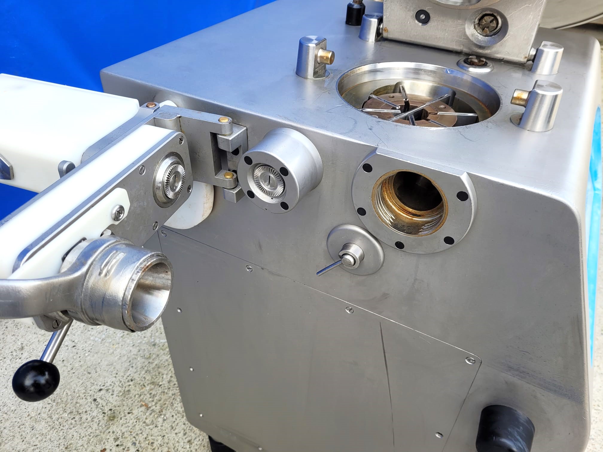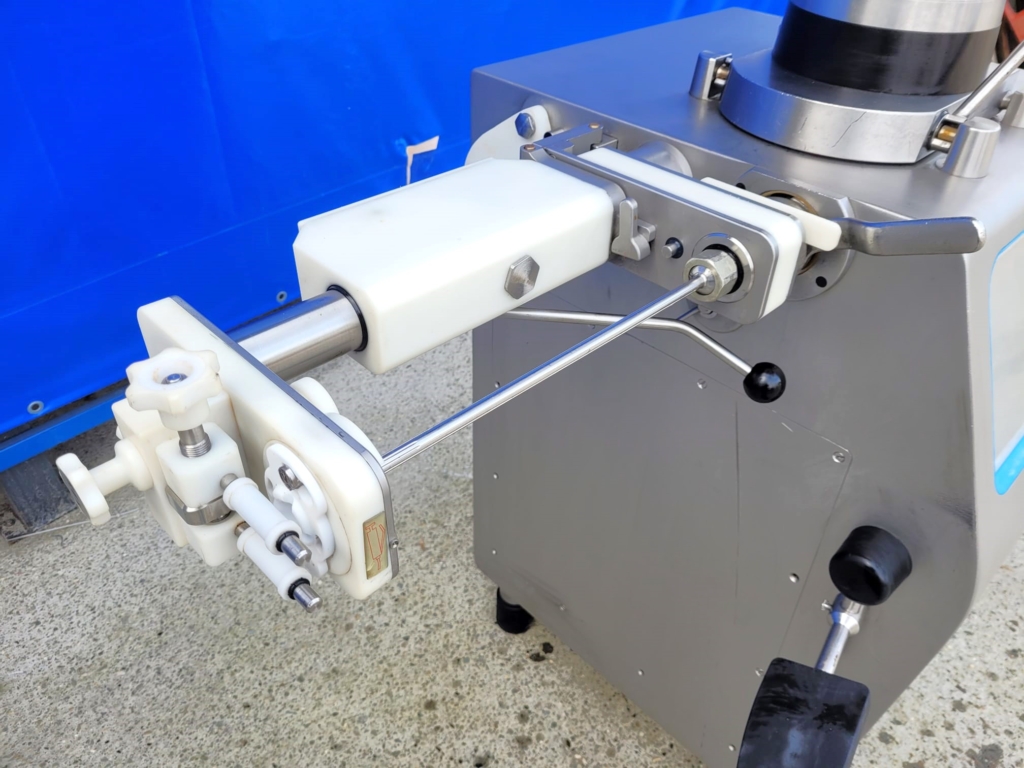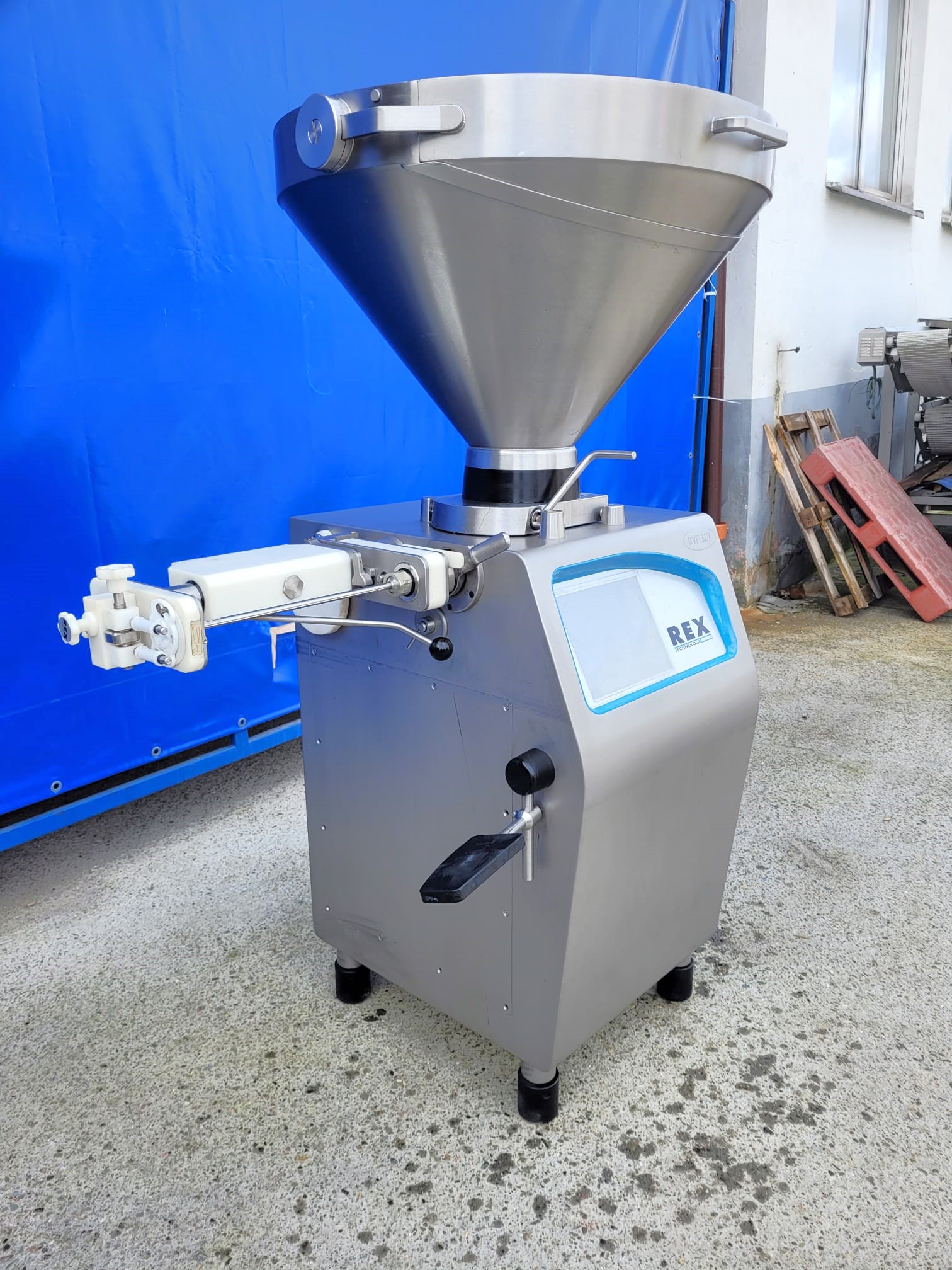 Nadziewarka próżniowa REX Technologie, model RVF 327. Przeznaczona do małych i średnich przedsiębiorstw, które produkują rożne ilości i asortymenty kiełbas. Nadziewarka wyposażona jest w sterowanie dotykowe, podtrzymkę i okręcarkę.