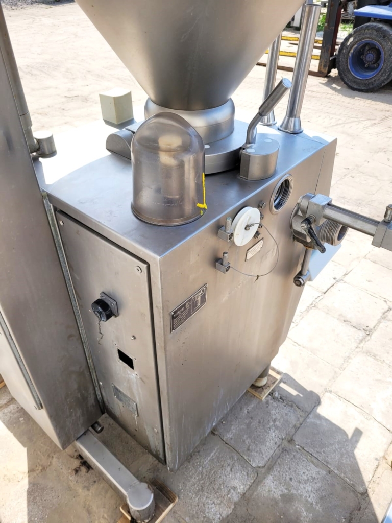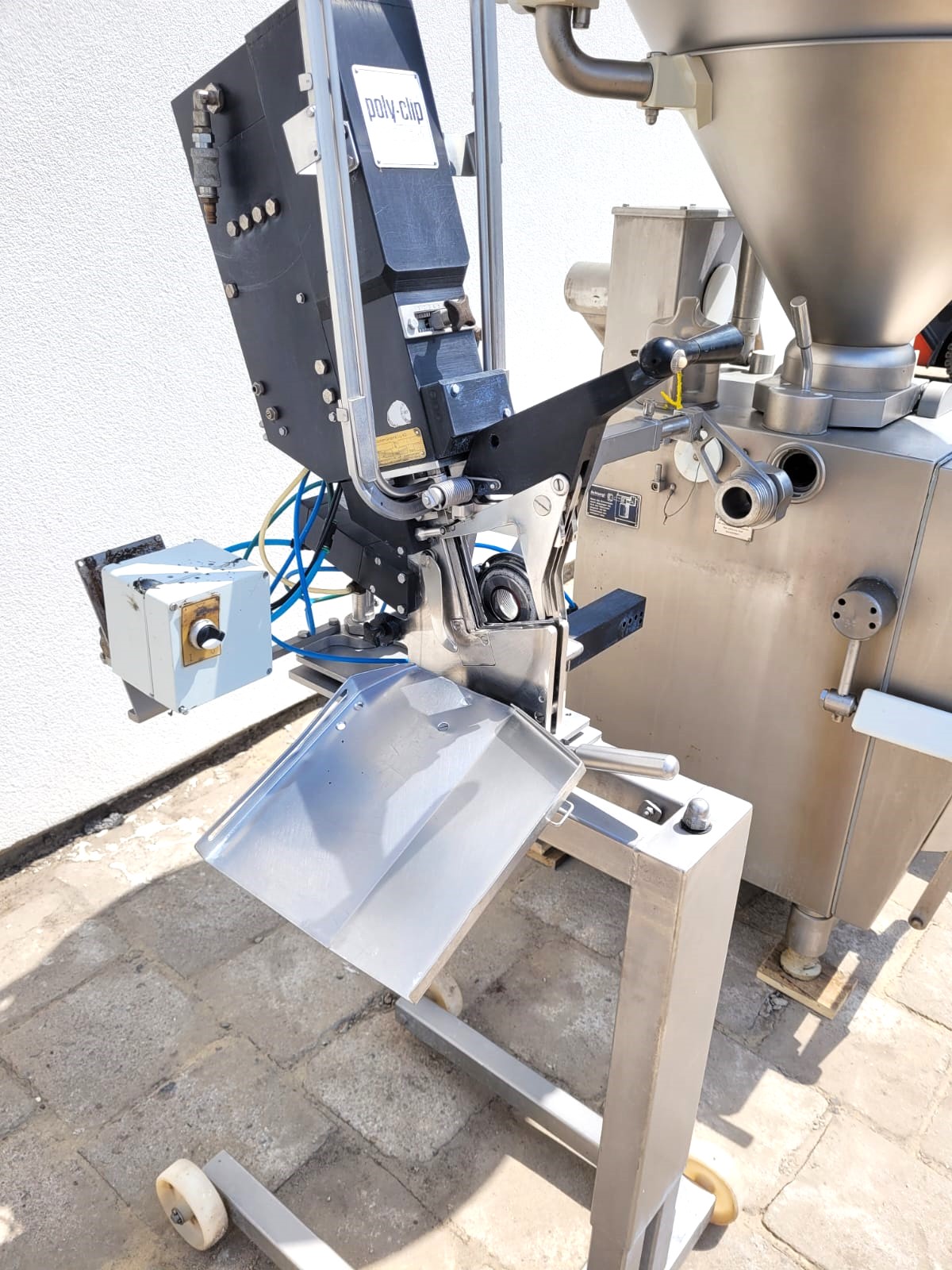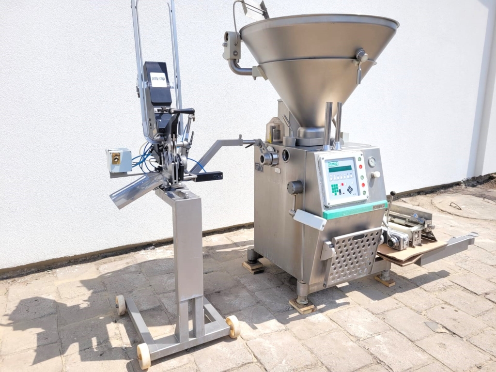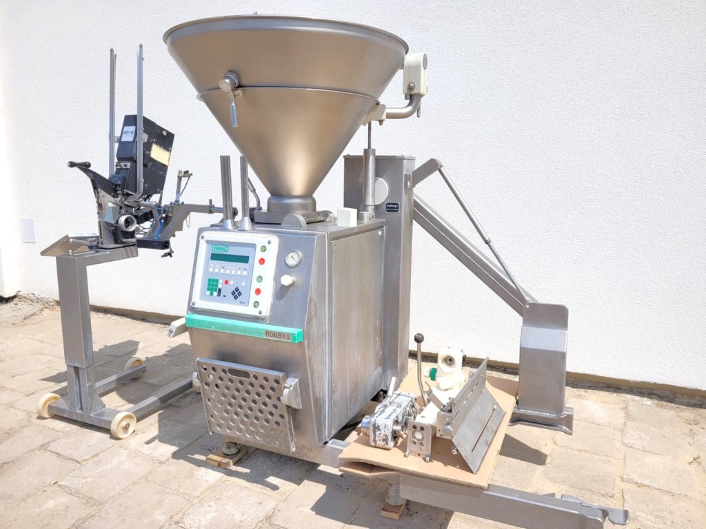 Automatyczna nadziewarka do kiełbas Vemag Robby 2 w zestawie z półautomatyczną klipsownicą PolyClip PDC700 to zaawansowany system stosowany w przemyśle spożywczym do automatyzacji procesu napełniania kiełbas mięsem lub innymi składnikami i bezpiecznego zamykania ich za pomocą klipsów.