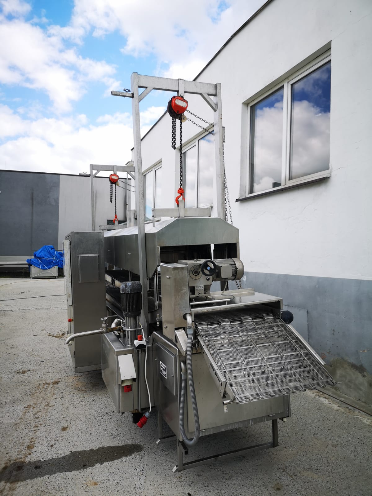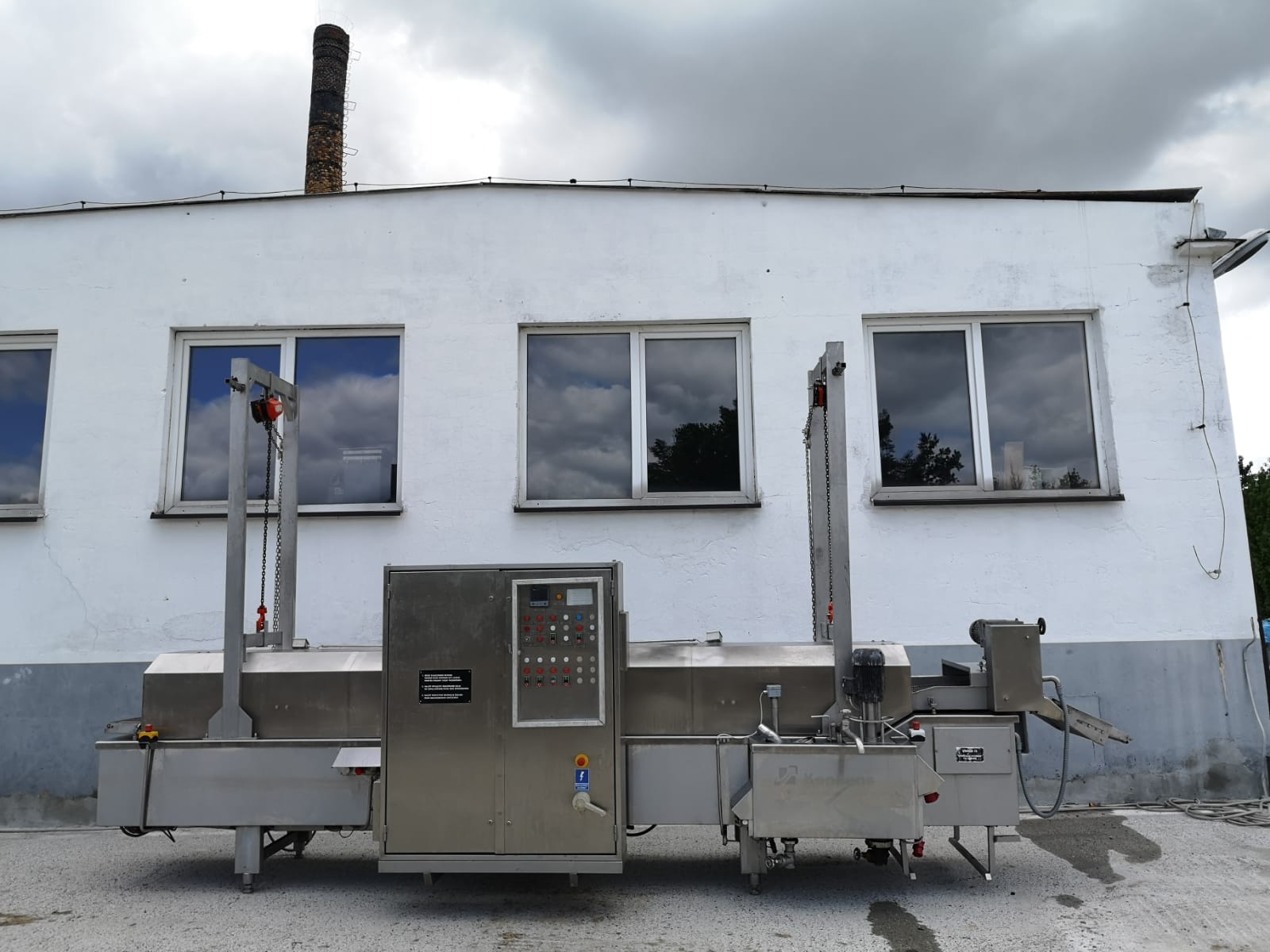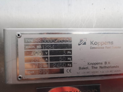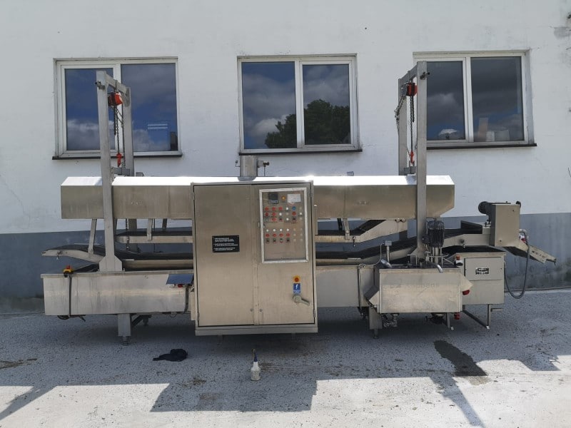 Używany smażalnik przelotowy Koppens. odpowiedni do wszelkich produktów spożywczych, które wymagają smażenia; na przykład: bryłki kurczaka, paluszki rybne, hamburgery itp. Wersja z elektrycznym grzaniem.